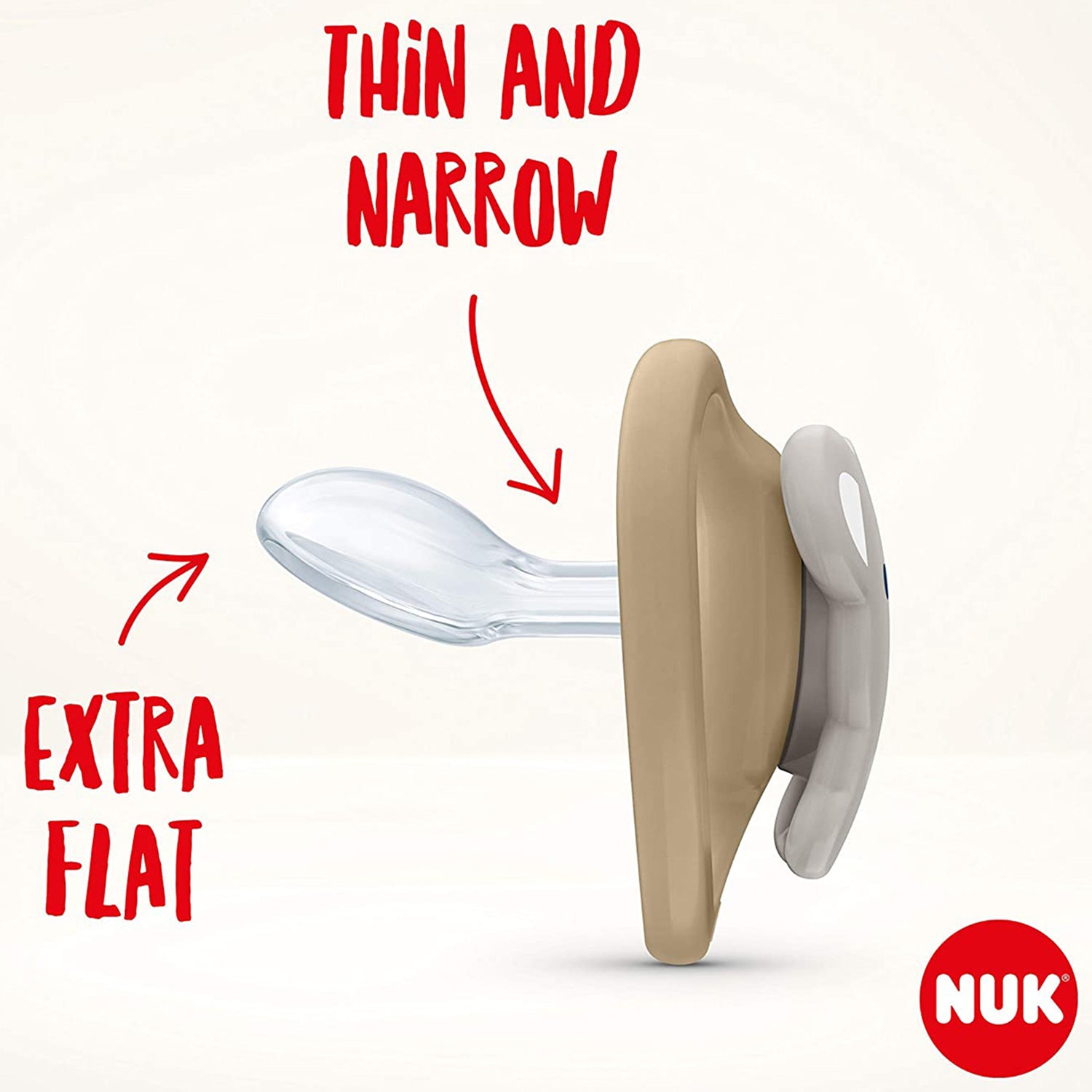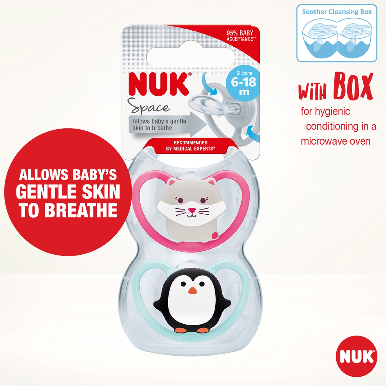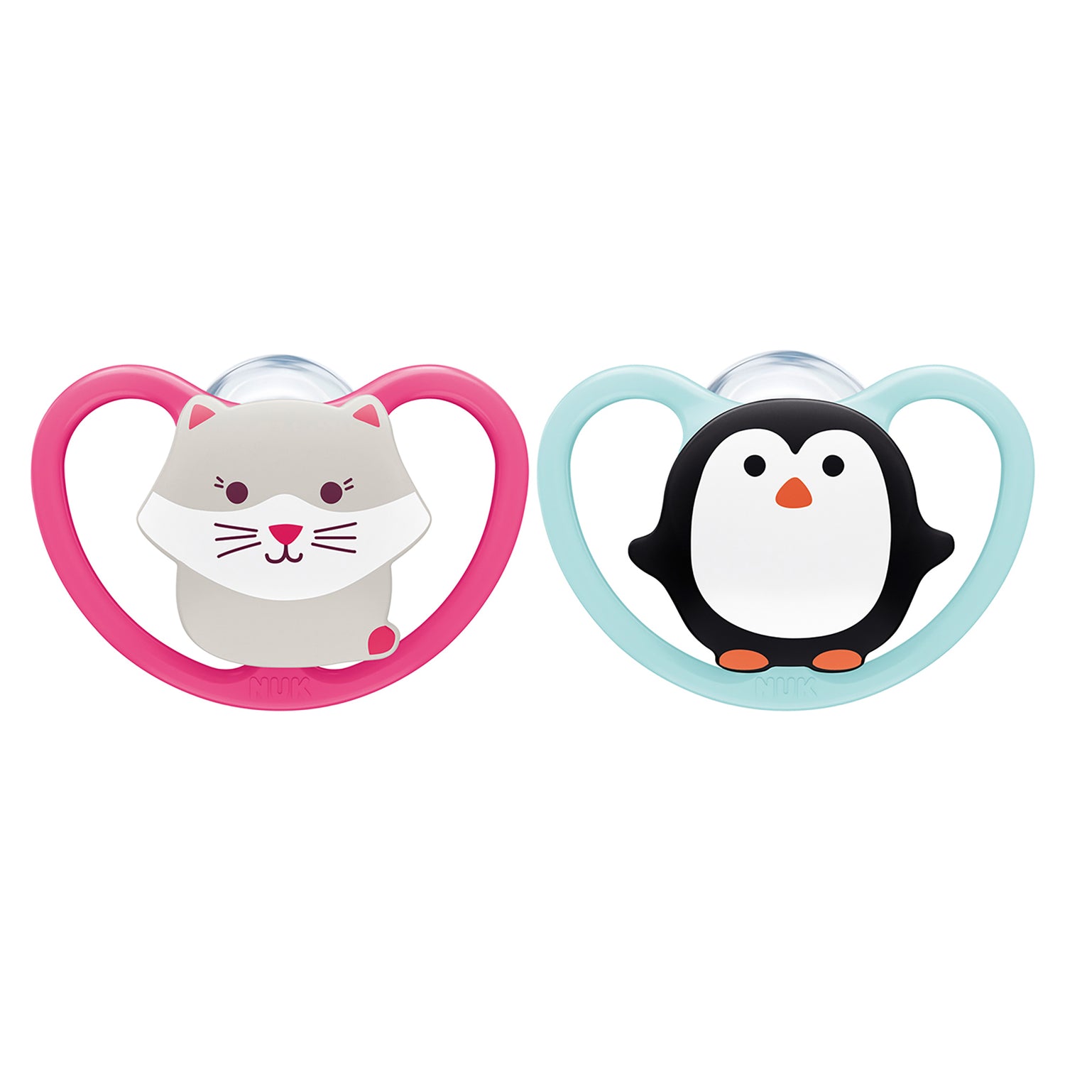 Allows more airflow to prevent irritation on skin. Orthodontic nipple shape is asymmetrical with a scooped bottom: Flatter to allow for more room for natural sucking motion, slimmer to reduce pressure on jaw and teeth, and narrower to help prevent teeth misalignment Heart-shaped shield fits perfectly under nose for easy breathing Pack of 2 NUK Space orthodontic pacifiers with fun animal designs Size 6-18 months BPA-free; Silicone baglet Easily clean pacifiers in microwave with new NUK reusable storage case