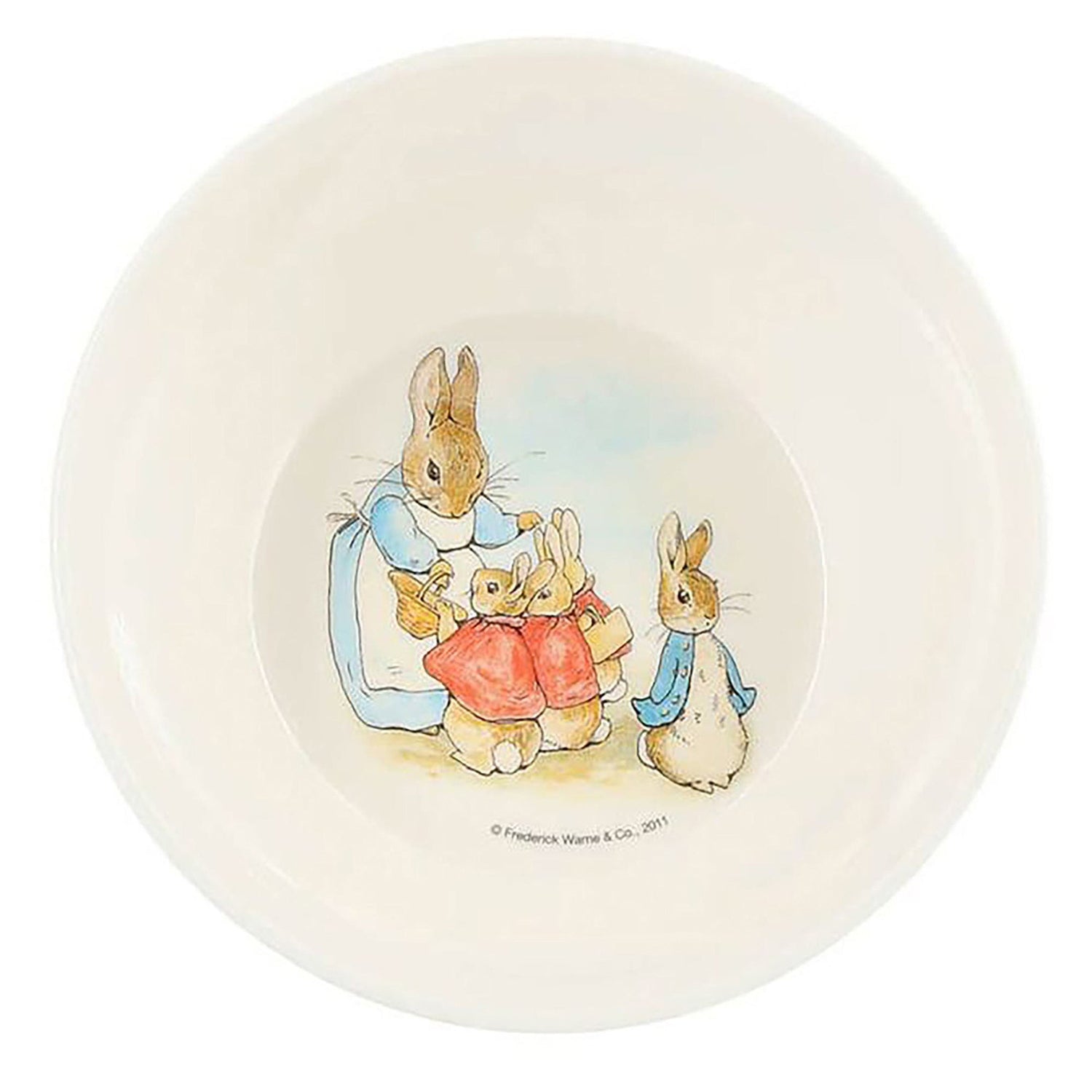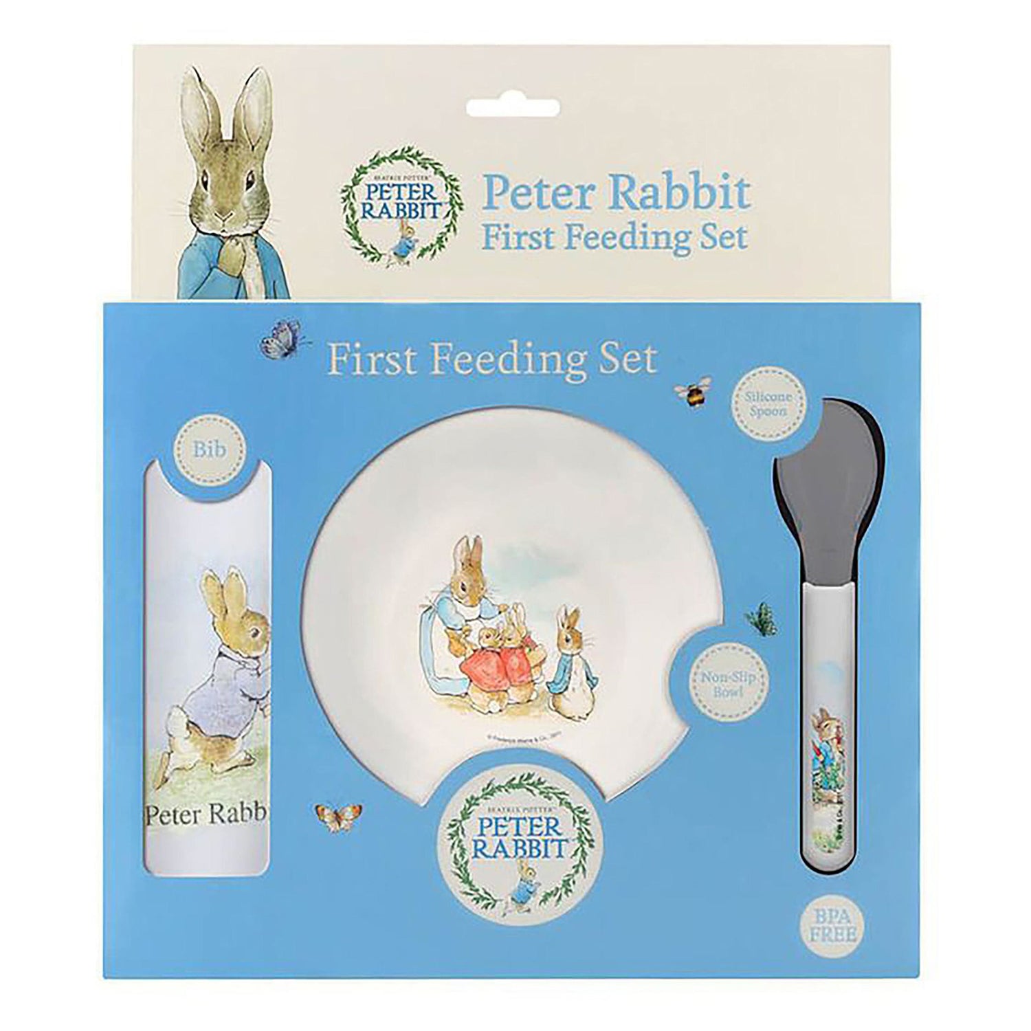 BEATRIX POTTER PETER RABBIT FIRST FEEDING SET Add a touch of nostaglia to mealtime with this adorable first feeding set, featuring Peter Rabbit from the world of Beatrix Potter. Set includes silicone spoon, non-slip melamine bowl and cotton bib. Age: Suitable for 6 months+