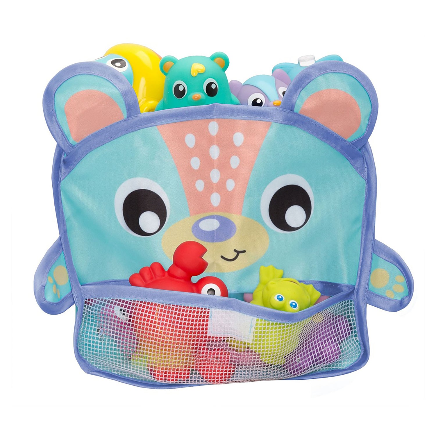 Theres a bear in my bath and its holding all my toys! When bath time is over and its time to pack up, its our Bear in the Bath Corner Organiser to the rescue! Designed with easy to use suction cups and shaped to conveniently attach in the corner above the tub, this generously sized, water proof storage unit features a mesh drainage panel to keep toys dry, helping to reduce mould. The easy open flap secures with Velcro and is perfectly positioned for baby to access their play things. A great way for baby to begin learning the basics of helping to tidy their belongings after play! Opening, placing and retrieving toys also exercises babys cognitive and motor skills while bears gorgeous character is a fun way to introduce imaginative adventure to bath time. Every baby bath needs a bear! Fun, practical and loveable.