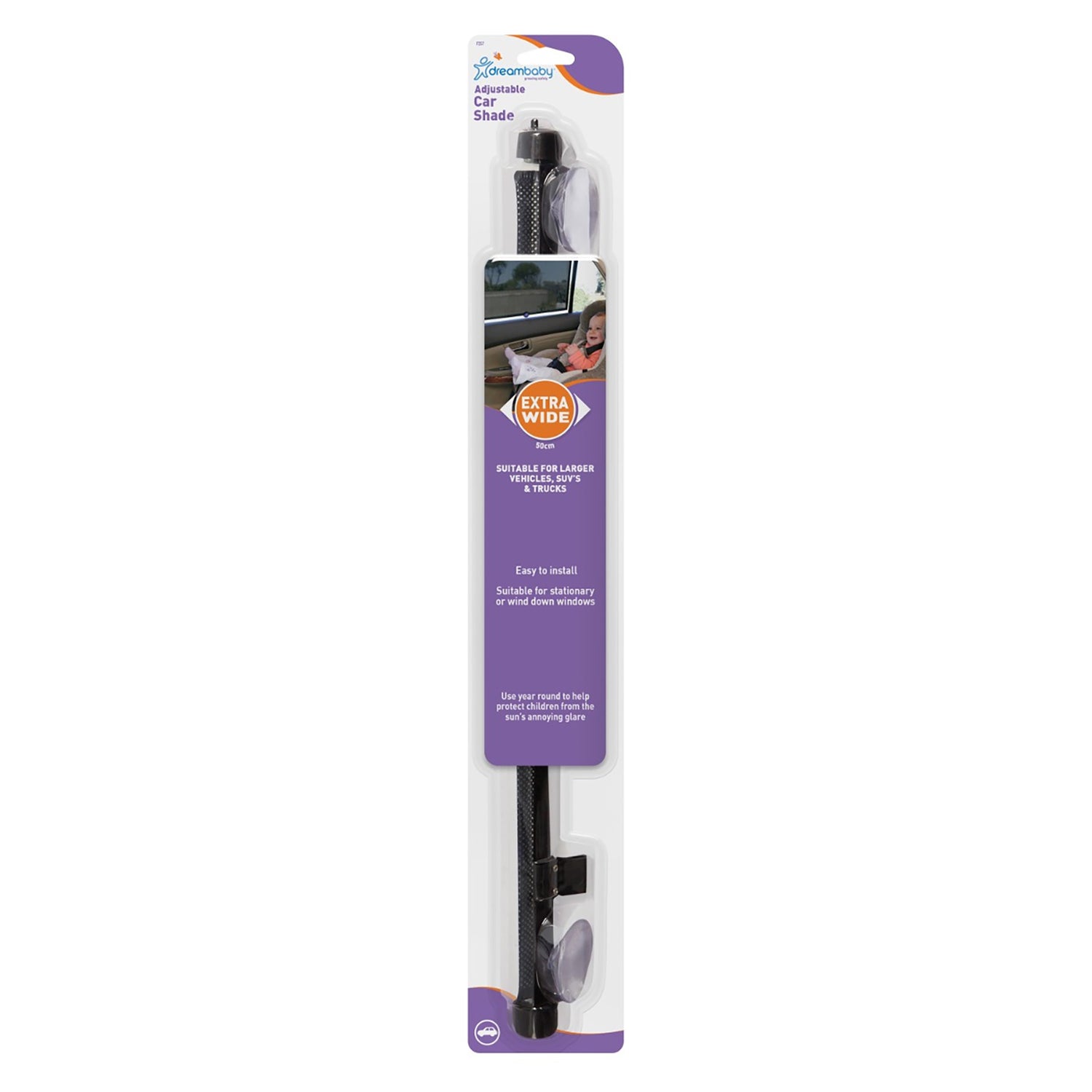 Dreambaby Extra Wide Car Window Shades help protect children from the sun's damaging rays and annoying glare no matter how far or short the journey. Dreambaby Extra Wide Car Window Shades are suitable for stationary or wind down windows. They unroll to 50cm (19.5").
