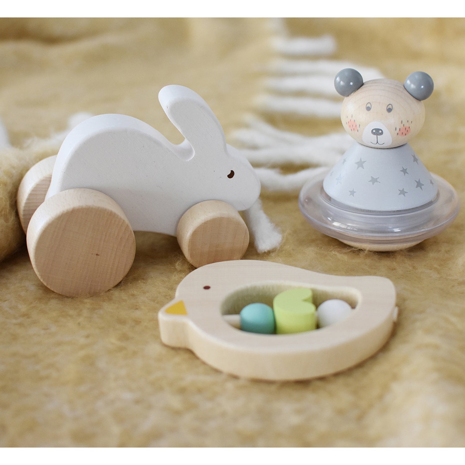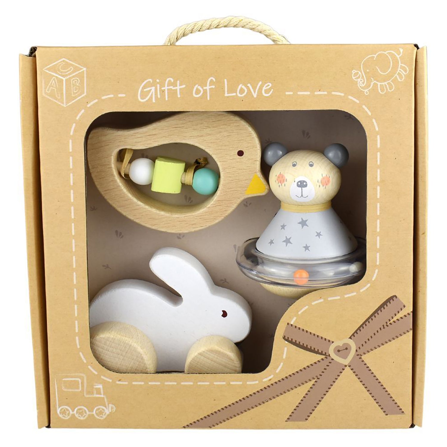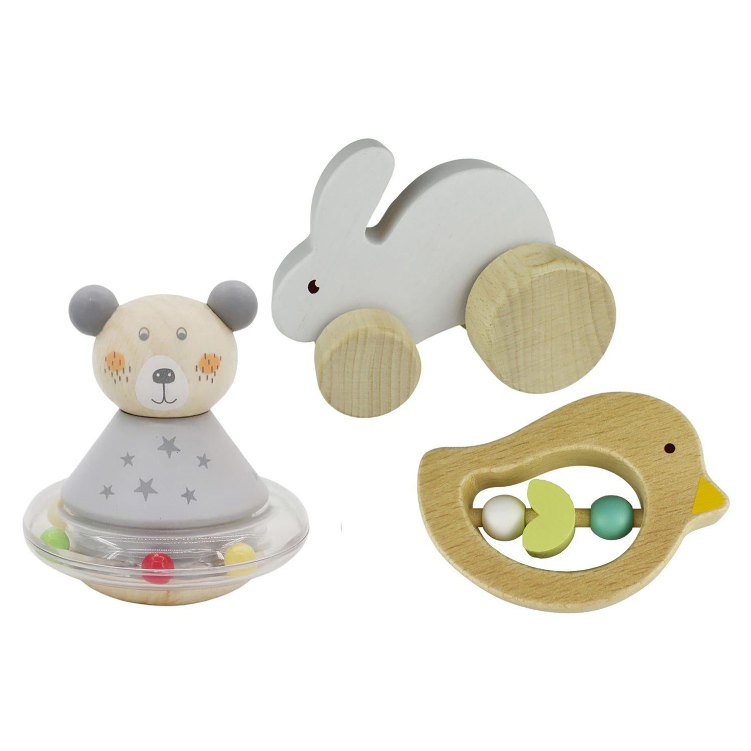 The perfect boxed gift set for any baby shower or birthday. This boxed set has everything you need for any baby to shake, rattle and roll. watch them grow with this selection of toys, where they learn to grasp and develop hand-eye coordination. As they get bigger, they enjoy shaking the rolling rattle to hear the noise of the beads and see them move and roll around. A little older and the push toy encourages tummy time and crawling. Each boxed set includes a wooden teether, a rolly poly rattle, and a push toy bunny. Each wooden Calm & Breezy Gift Box set from Kaper Kidz is made from timber, finished to the highest quality, and painted in child-safe, non toxic paint. Suitable Age: 12 Months +