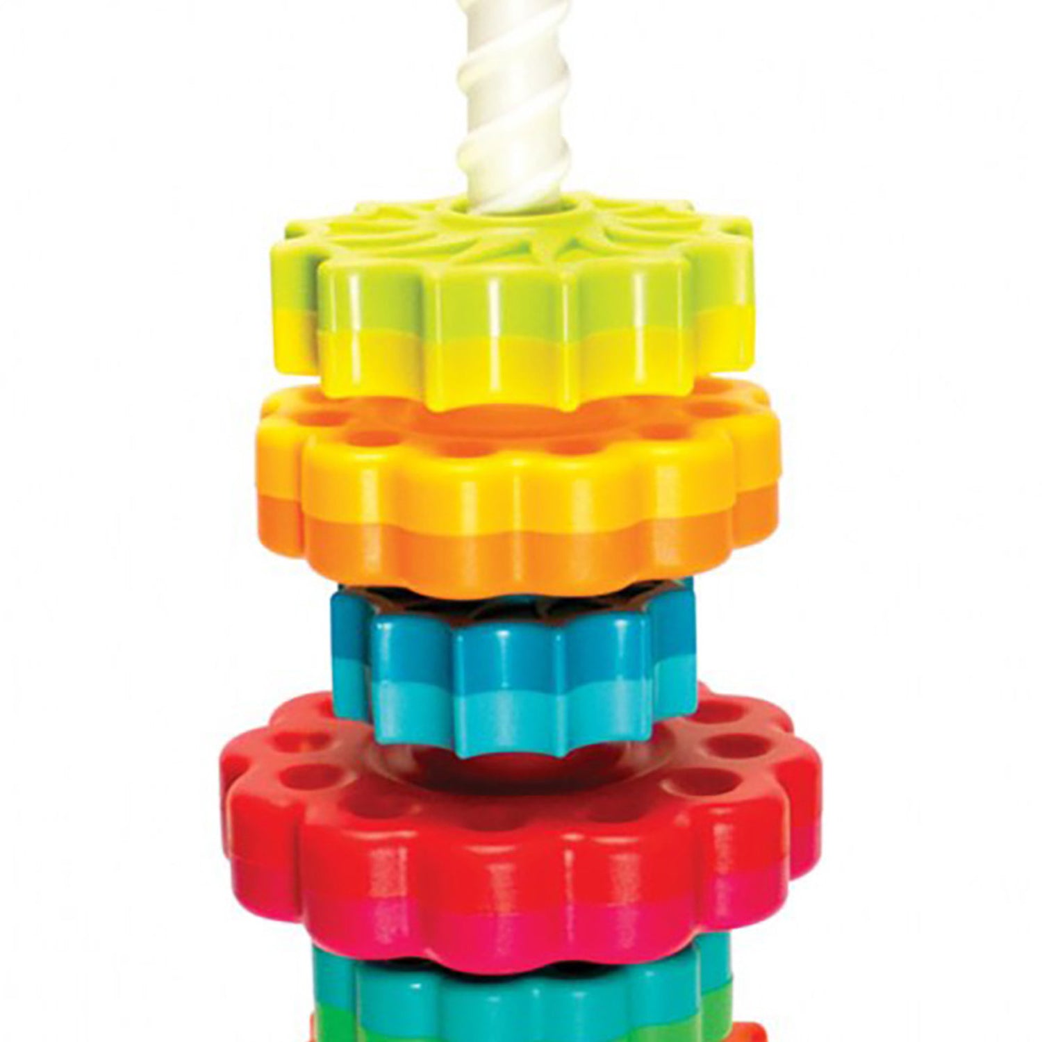 It's a stacking toy with a spin literally! Drop the vibrant discs onto the threaded corkscrew pole and go ooooh as they spin fast and smooth to settle onto the reversible base. Choosing how to set the base is half the fun for your toddler. Pick either the wobble base or turn it over for a solid seat.Each disc is dual-coloured, and from largest to smallest, they form a dynamic rainbow utilizing fun shades like magenta, lime, and teal, and your more traditional shades of lemon, red, and sky blue. The star-like discs alternate between daisy style and star-burst shapes, too. Want to make a rainbow? Want to keep all the round-edged shapes separate? You can! Even the smallest disc can spin all the way to the base.