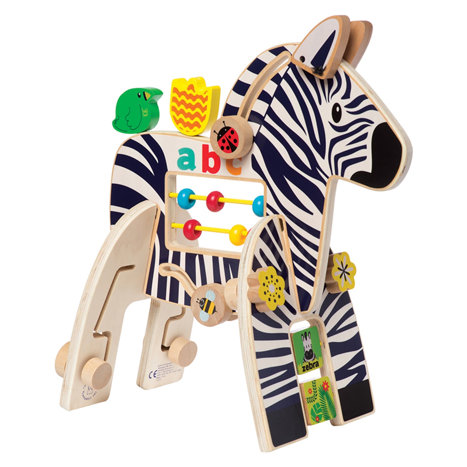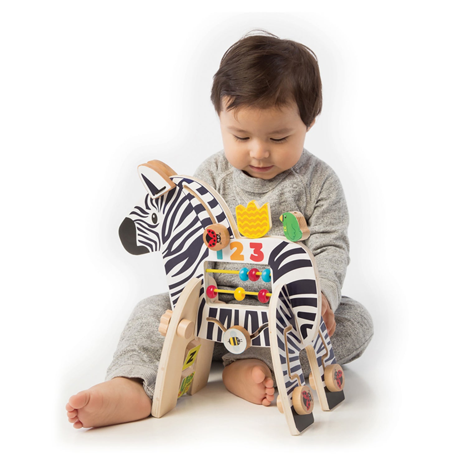 This adorable zebra will provide hours of fun for active toddlers. The design features a bead run, springy flowers, spinning gears, and a green bird friend.