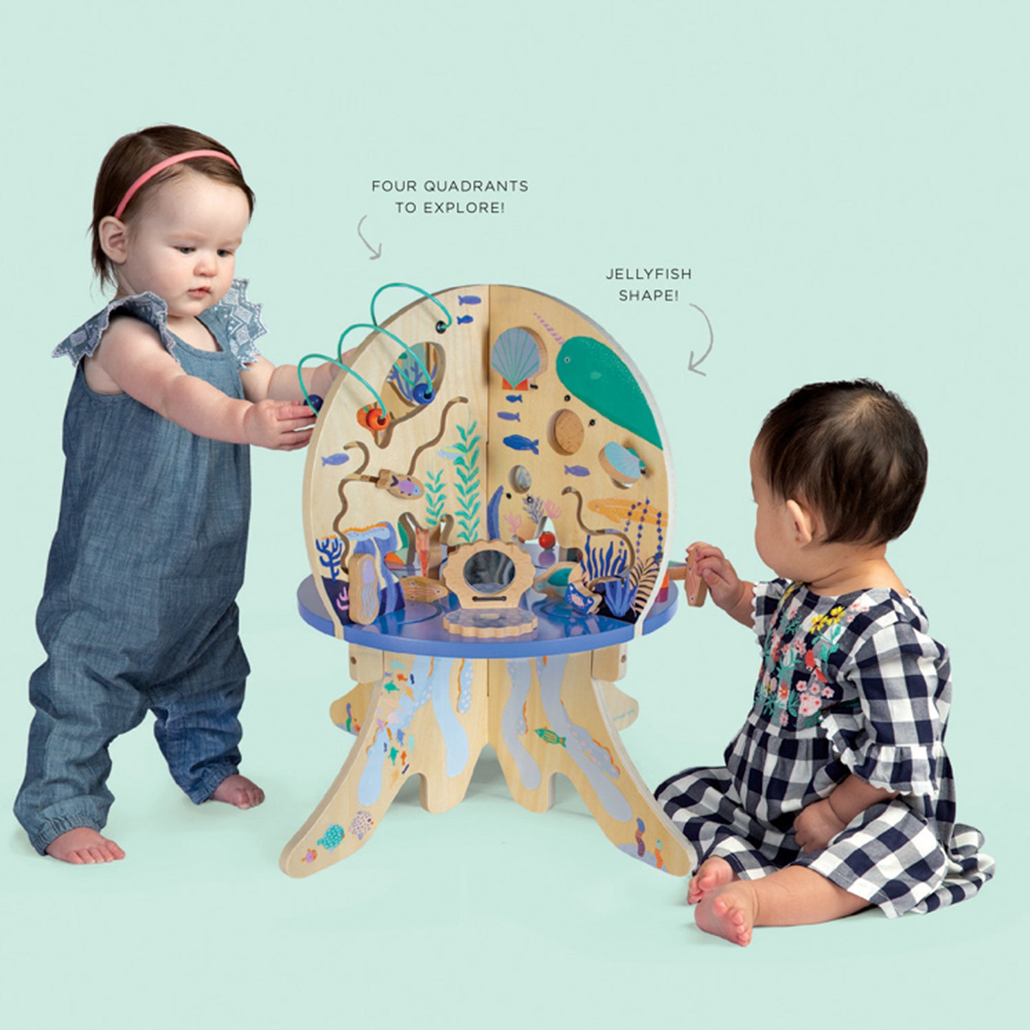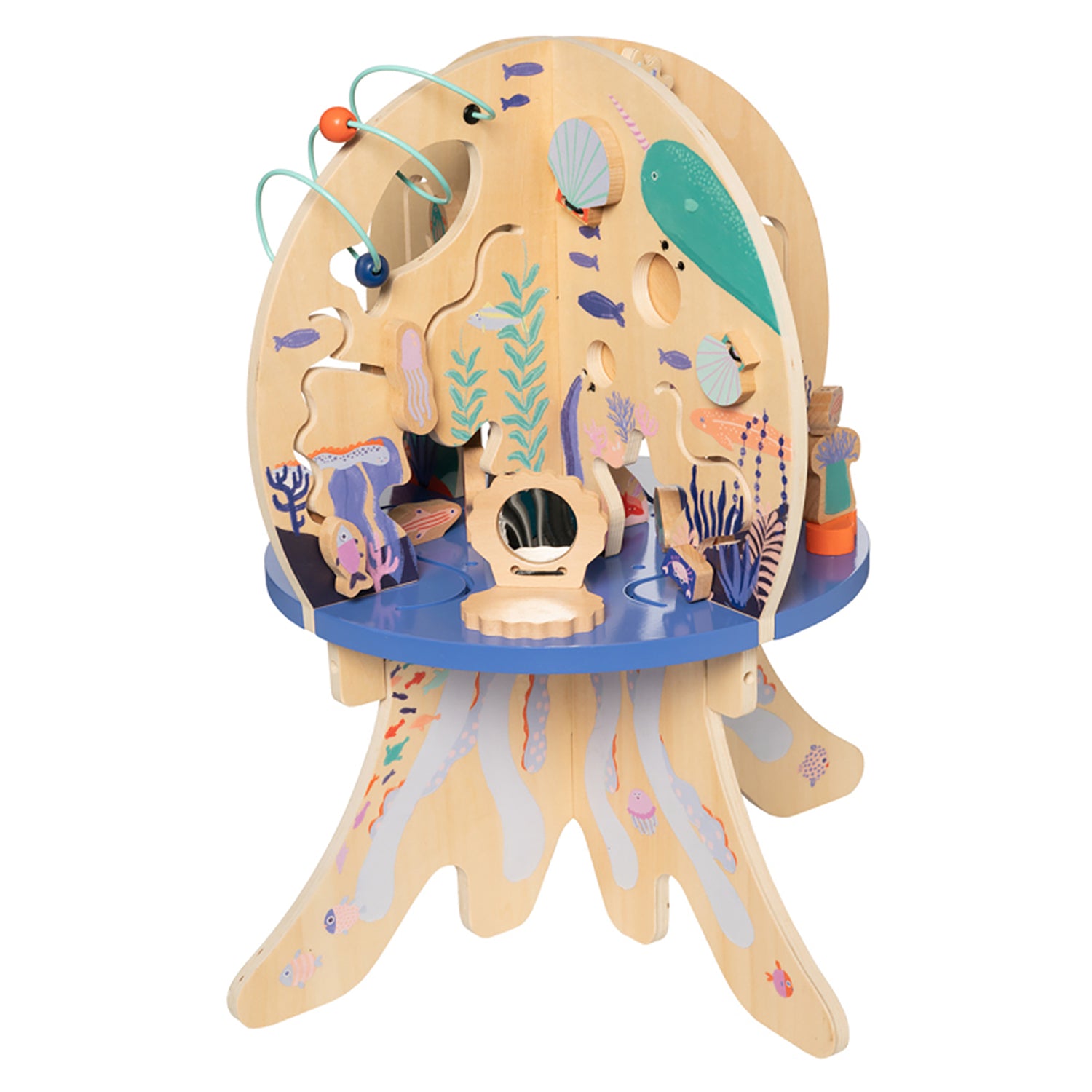 An adorable wooden activity centre that is packed full of exciting interactive play options. The design includes 4 quadrants in the shape of a jellyfish with a variety of activities for baby: gliders, bead runs, spinning gears, springy coral, clacking clams and peekaboo mirror.