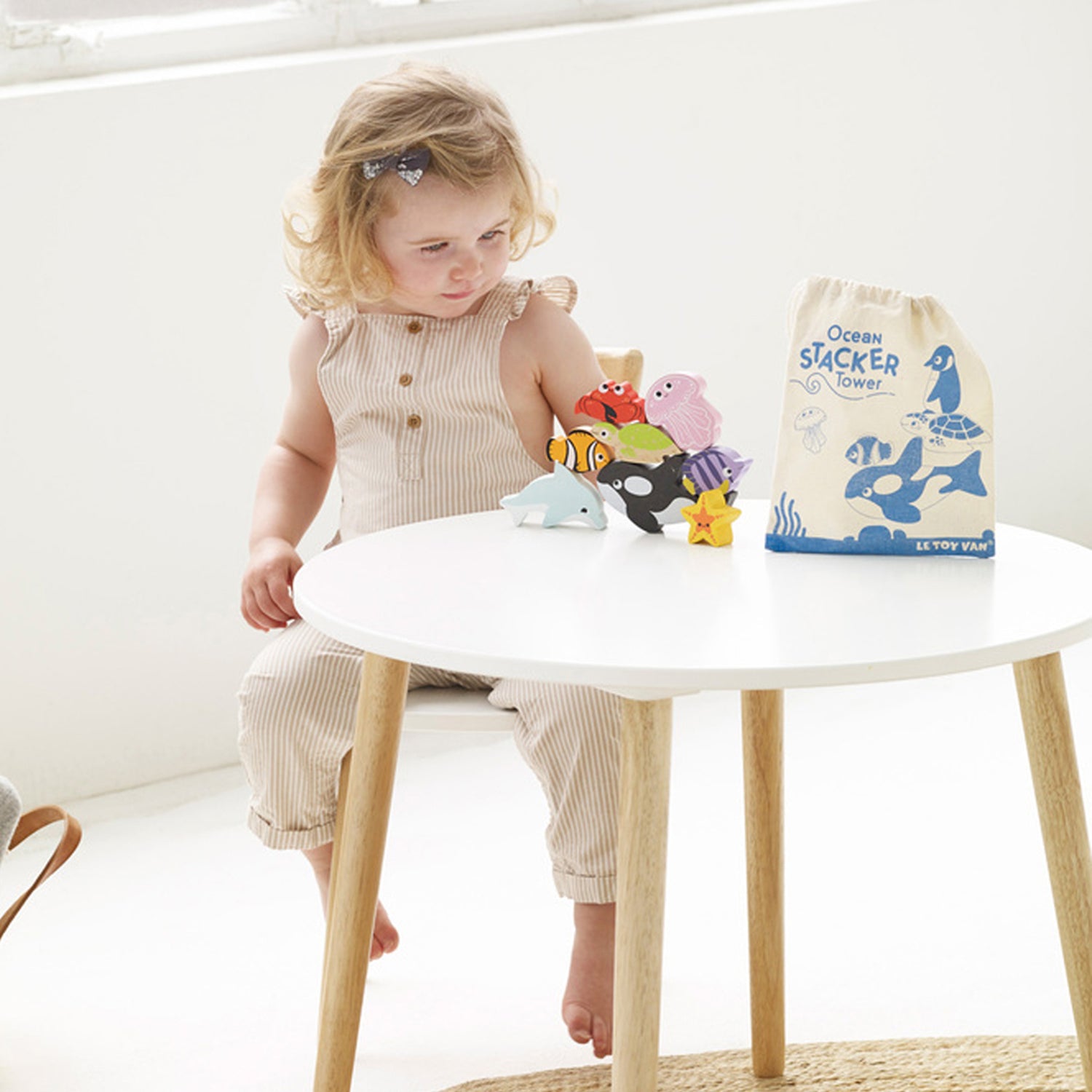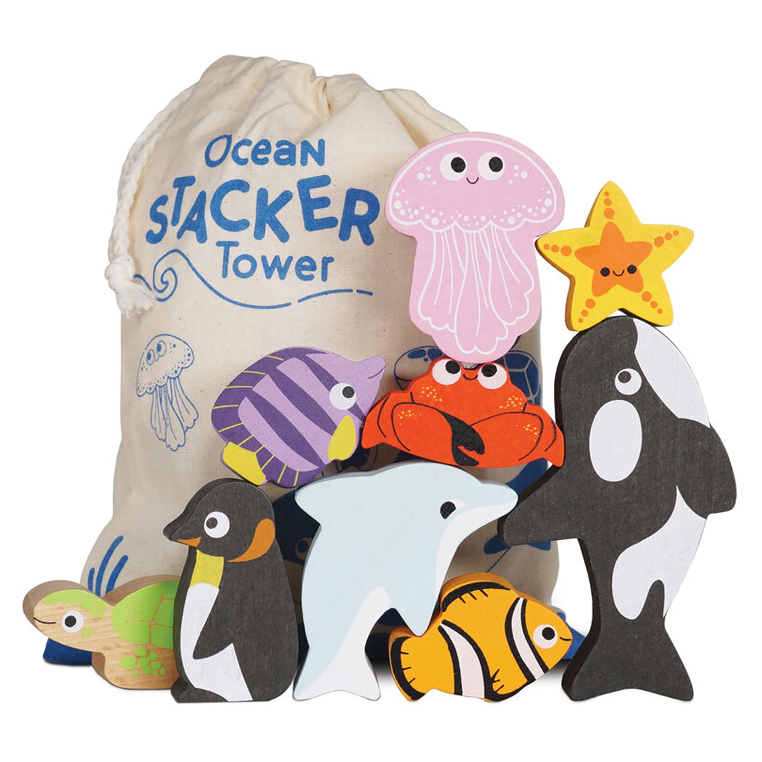 Are you ready for an adventure under the sea? This adorable ocean stacker set contains 9 aquatic animals that can be balanced into towers or used in imaginative open-ended play. The animals are made from sustainable FSC wood and decorated in safe water-based, chip-resistant paints. The set comes packaged in a cotton bag making it great for on-the-go play. The animals featured include;
