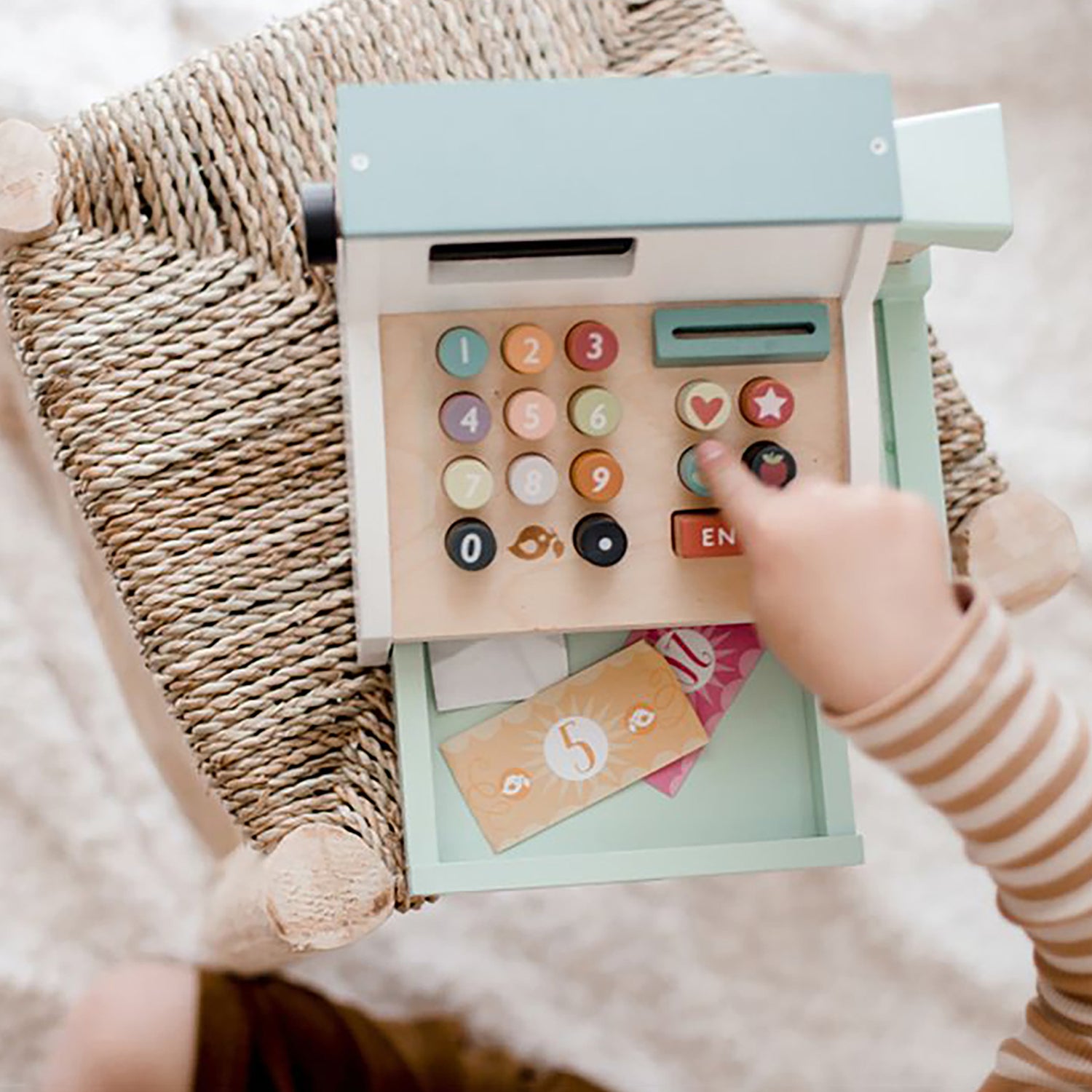 Children will enjoy ringing up all their shopping with this fun and colourful wooden till. Slide credit cards along the groove, pop one of 5 printed receipts into a slot, turn the little knob to show different prices through a window. Children will have fun pressing down on the multi-coloured buttons and opening the tray to dispense 5 wooden coins and 9 sheets of coloured paper money.