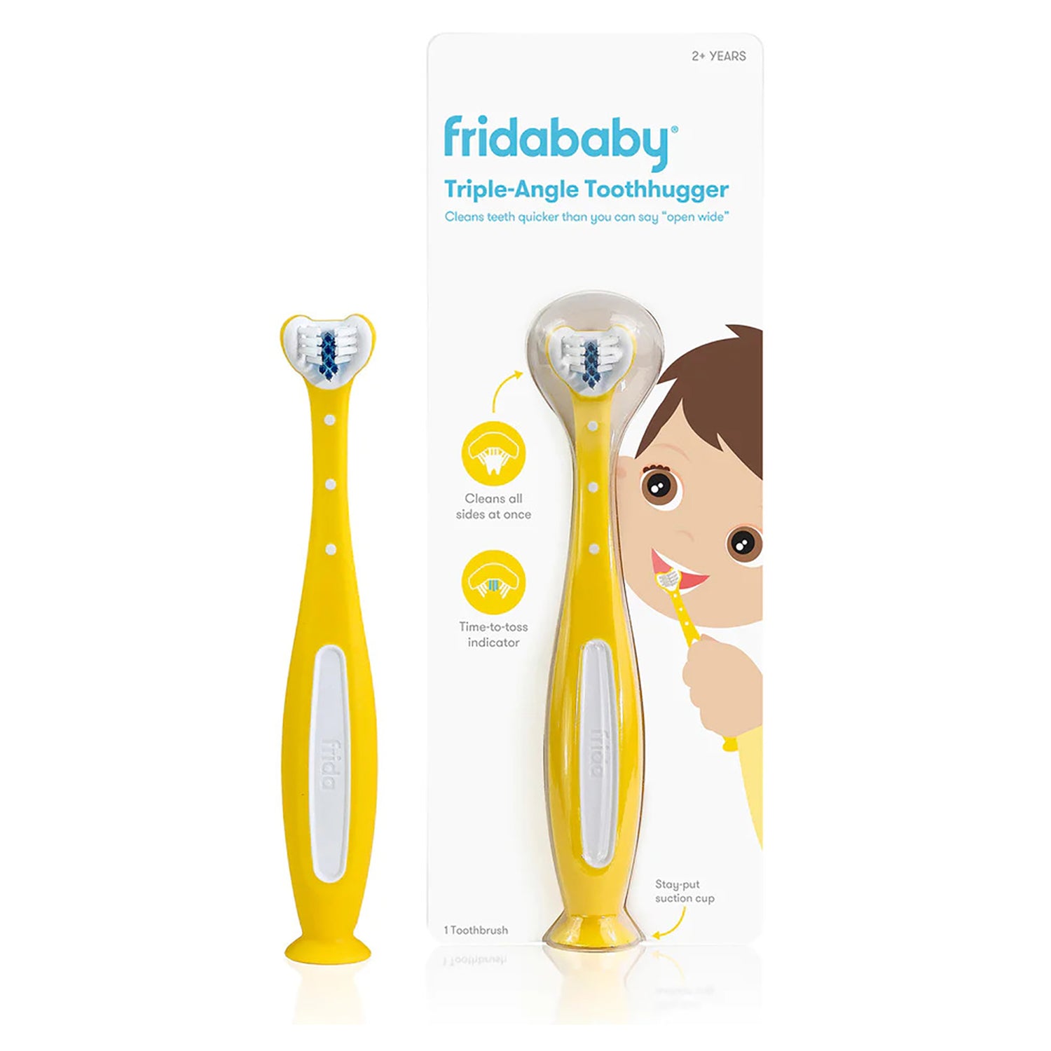 Put the brushing battle to bed! The Toothhugger's unique triple-angle brush head attacks plaque fast by cleaning all sides at once. Specially designed with little brushers in mind, its easy-to-hold handle suctions to surfaces, while soft bristles are gentle on sensitive gums and even change colors to let you know when it's time to replace.TRIPLE-ANGLE BRUSH. Dentist-recommended, unique brush head cleans all sides of the tooth all at once.TIME-TO-TOSS INDICATOR: Blue bristles fade to white, so you know when to replaceLEARN TO BRUSH: Designed for toddlers, this toothbrush is a great way to help your little one practice proper brushing techniques, with your help.SOFT AND GENTLE: Soft, rounded bristles are gentle on your little one's teeth and gums.