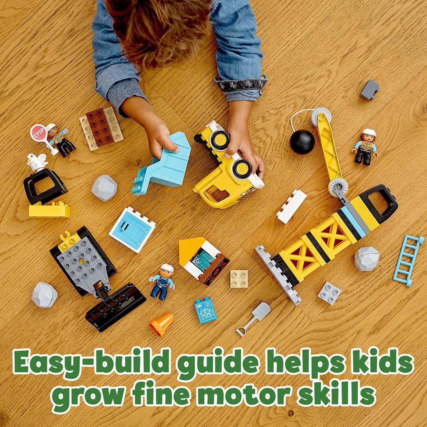 Includes 2 contemporary construction-worker figures, a push-along truck with a tip function, a push-along excavator with a rotating digger, and a toy boulder that kids can open up. Parents and caregivers share developmental milestones with their little builder as they join in the imaginative construction-site fun. Fine motor skills and problem-solving abilities develop as kids operate the vehicles. If you're looking for the best toy for a toddler's growing needs, this building-site set is packed with features and functions to stimulate and inspire the minds of curious kids aged 2 and up. The truck measures over 4" (11cm) high, 5" (14cm) long and 2" (7cm) wide and the excavator measures over 4" (12cm) high, 7" (18cm) long and 2" (7cm) wide - the perfect size for little hands to pick up and place. No batteries needed. The LEGO DUPLO Truck & Tracked Excavator playset is powered by kids' imaginations - so the hands-on, creative fun never ends! Clear instructions help to maximize the fun and the developmental benefits - so parents and toddlers are sure to get the most from the versatile playset as soon as they open the box. LEGO DUPLO playsets are designed to entertain, stimulate and inspire the minds of preschoolers. With familiar scenes, fun characters and toddler-friendly pieces, they unleash young imaginations with open-ended play. Since 1969, LEGO DUPLO toddler toys have met the highest industry standards. This ensures they are easy for little fingers to pick up, place and pull apart - every time. The LEGO Group drops, heats, crushes, twists and analyzes the bricks and pieces that make up LEGO DUPLO playsets to be sure every little builder's toy meets the highest global safety standards.