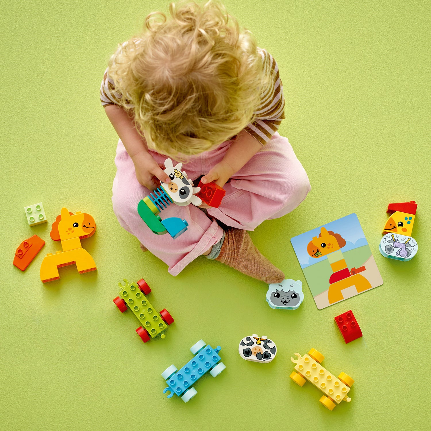 Know a youngster who loves creative play and nature toys? Introduce toddlers aged 18 months and up to color-matching play with the LEGO® DUPLO® My First Animal Train (10412) set.This preschool kids’ learning toy comes with 4 cute, buildable animals toys – a rooster, horse, lamb and cow – that transport toddlers on a journey of fun role play. Toddlers learn problem-solving skills as they follow the cards to construct the animals then match them to the colored train toy carriages. This vehicle toy also includes 2 extra bricks to let kids express their creativity as they build and rebuild the animals into toy figures of their own invention. Playful features, such as the rooster’s flexible neck and the toy train carriages that connect help hone a toddler’s motor skills.LEGO DUPLO animal toys for toddlers put open-ended fun, self-expression and joyful exploration into young children’s hands while parents share their child’s precious developmental milestones.