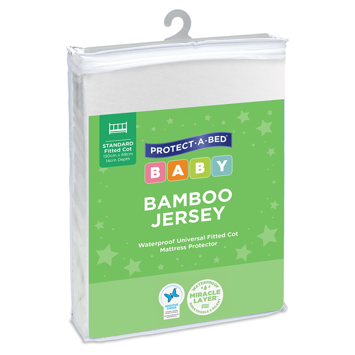 Protect-A-Bed's Tencel Jersey Large Bassinet Mattress Protector is best for sensitive skin, this fitted TENCEL(TM) Mattress Protector features a silky and cool TENCEL(TM) sleep surface, made from natural wood-based fibers. Protecting your child's cot from spills and stains, and the allergens caused by dust mites, mold, and bacteria.Bamboo Jersey (Viscose/Rayon) sleep surface. Luxuriously soft for baby's comfort.Including Protect-A-Bed's Miracle Layer it is not only waterproof but soft, and breathable.Protects your mattress from spills and stains.Acts as an anti-allergy barrier. Providing your baby with protection from dust mites, mold, and bacteria allergens.In a fitted sheet style it can easily be removed for regular machine washing and tumble drying with other linensThe Expandall polyester fitted skirt suits all standard and extra-depth mattressesRecognized by the National Asthma Council's Sensitive Choice ProgramRecognized by the Eczema Association of AustraliaOeko-Tex Standard 100 approvedStandard Fitted Cot 130 x 68cm +14cm