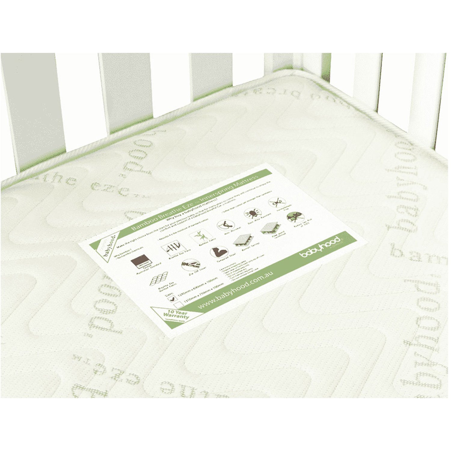 The babyhood Bamboo Breathe Eze Innerspring Mattress is designed to provide your baby with optimum support for their delicate body, with a firmer and safer innerspring mattress. The bamboo cover is perfect for your baby's delicate and sensitive skin, with its super soft feel, keeping your baby more comfortable through all the seasons. The bamboo cover also zips off for a more hygienic sleeping environment, so no more spot cleaning your mattress cover. 1295x690x100mm.
