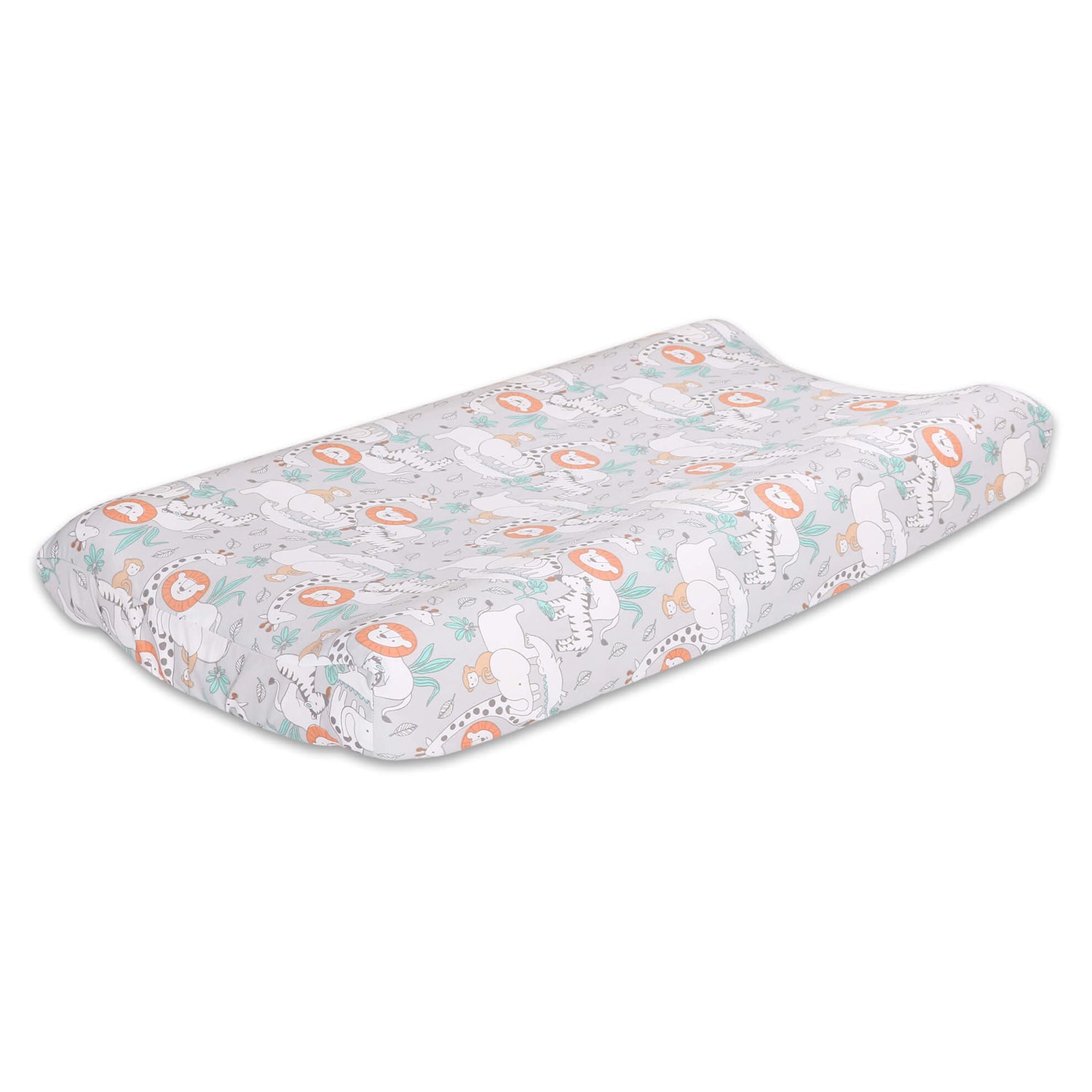 The Safari Adventure Changing Pad Cover from The Peanut shell Features: a playful conversational Safari Print of animals and plants on a white background, and creates a soft layer next to baby's skin.