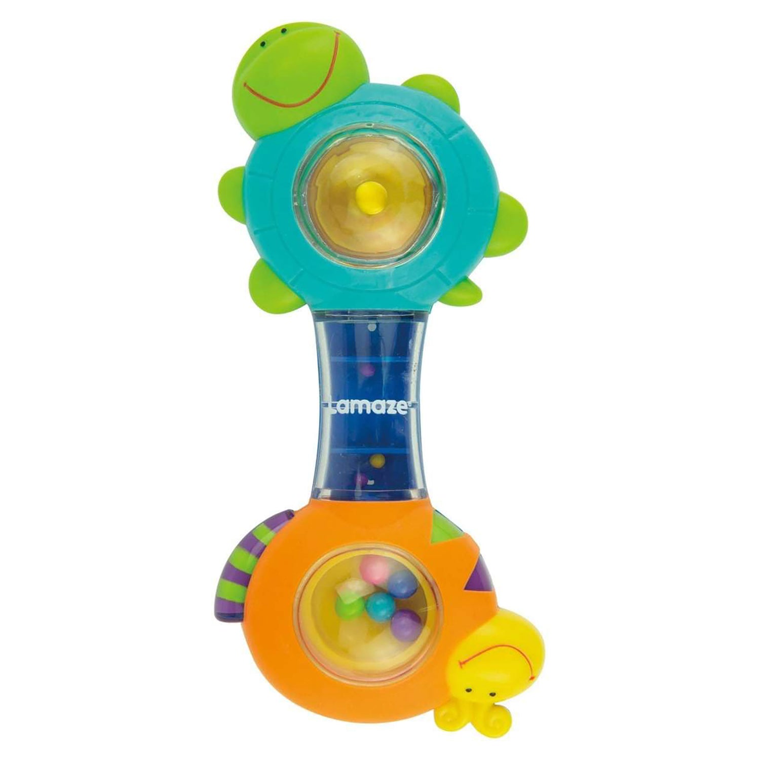 The Shakin' Shells rattle from Lamaze is the perfect size and shape for little hands to grip, with its lightweight design making it easy for very young children to hold and play with. The brightly coloured, cheerful snail and tortoise characters keep baby entertained and visually stimulated whilst various beads inside create a variety of sounds and sensations.
