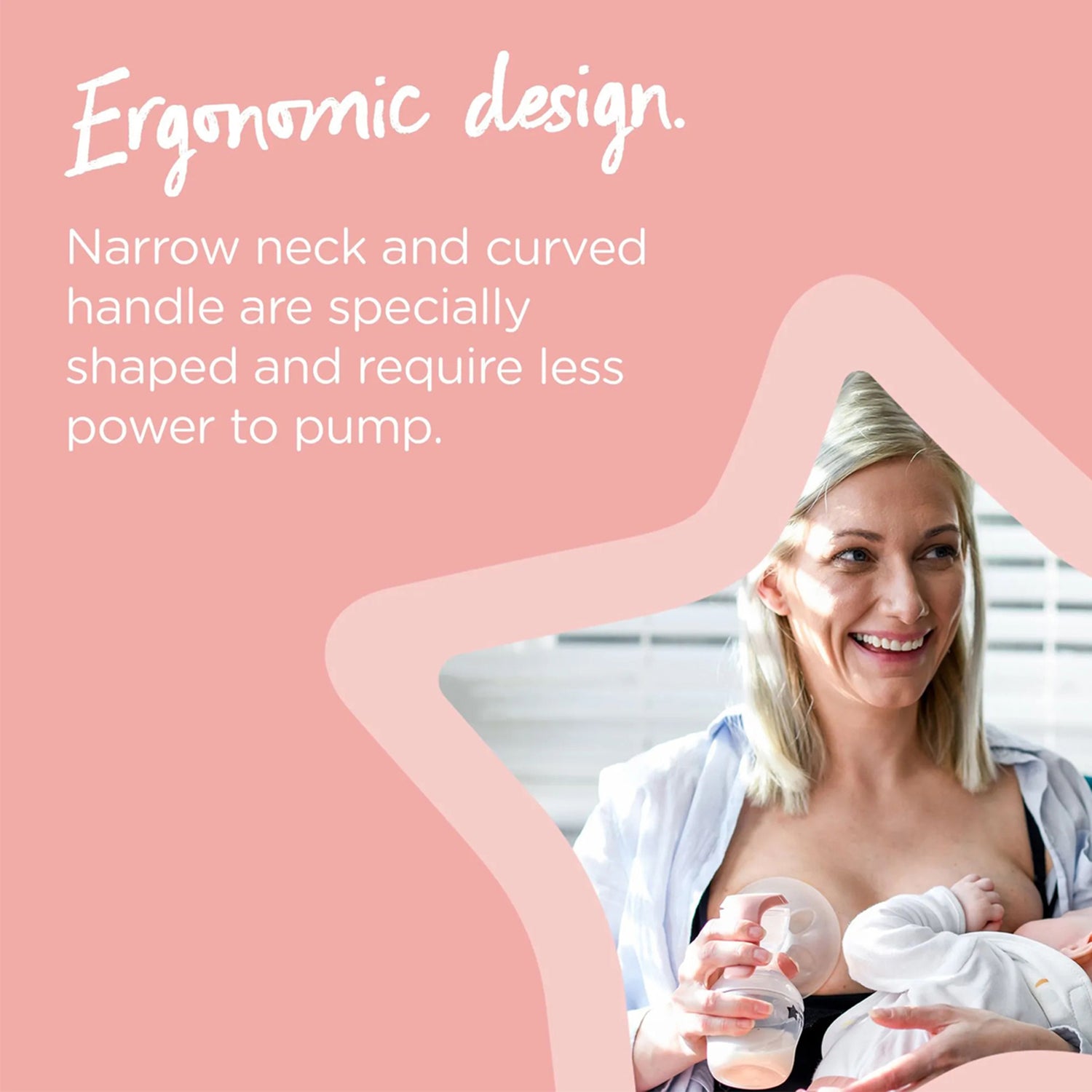 Easy to use one-handed, its perfect for busy mums who are on the go or caring for baby with their other hand. Ideal for occasional use wherever you choose, or to express from one breast while your baby feeds from the other, this breastmilk pump features a cup with massaging petals to help stimulate milk flow. The manual breast pump even comes with a 150ml Closer to Nature baby bottle with measurement markers so you can keep track of how much youre expressing. It also connects to all sizes of our Closer to Nature and Advanced Anti Colic baby bottles*, making it easily adaptable to your unique breast pumping experience. Free from cords and tubes, this Tommee Tippee Manual Breast Pump is the ultimate travel companion and is compact enough to fit in your handbag or changing bag. Its extremely lightweight so it doesnt weigh you down and has a discreet design that allows for quiet pumping at work, the caf or at home while baby sleeps. The horn has a hygienic one-piece design thats easy to assemble and disassemble, so you can get on with expressing quickly and easily. This also makes cleaning the pump, whether in hot soapy water, the dishwasher or steriliser, simple and stress-free. The innovative built-in closed system means all your precious breastmilk only goes into the bottle, so you dont waste a single drop. Made from completely BPA and BPS-free materials, you can rest-assured that your baby has a super-safe feed.