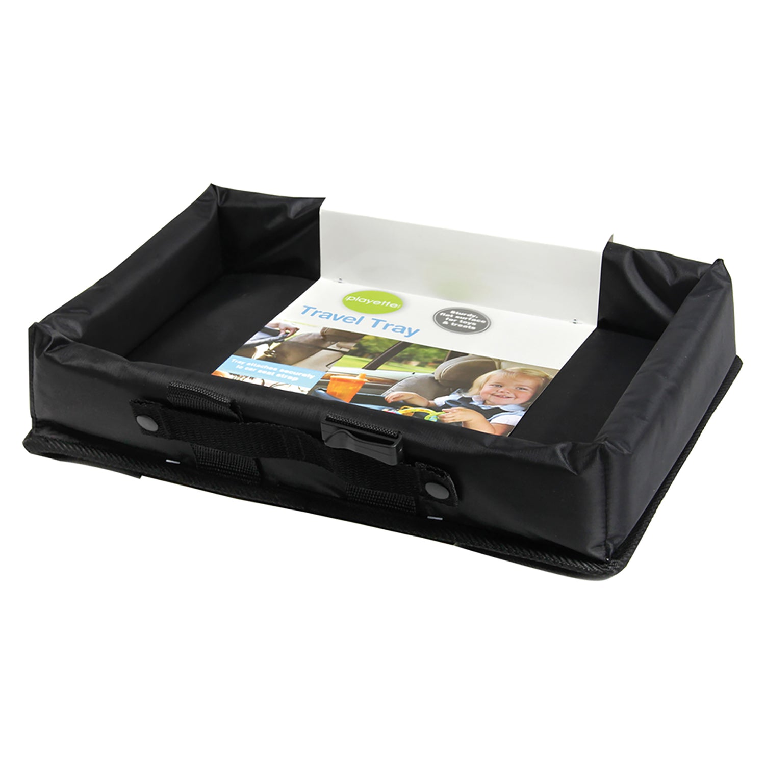 Playette Travel Tray has a sturdy flat surface with padded sides to keep toys or snacks on the tray. It's a great way to keep your child entertained. The tray attaches to the car seat strap to prevent it from moving away from the child's lap. The Travel Tray can also be used when dining out and provides a clean eating surface. It has an elastic loop to secure toys. Hand wash with warm water to keep clean.