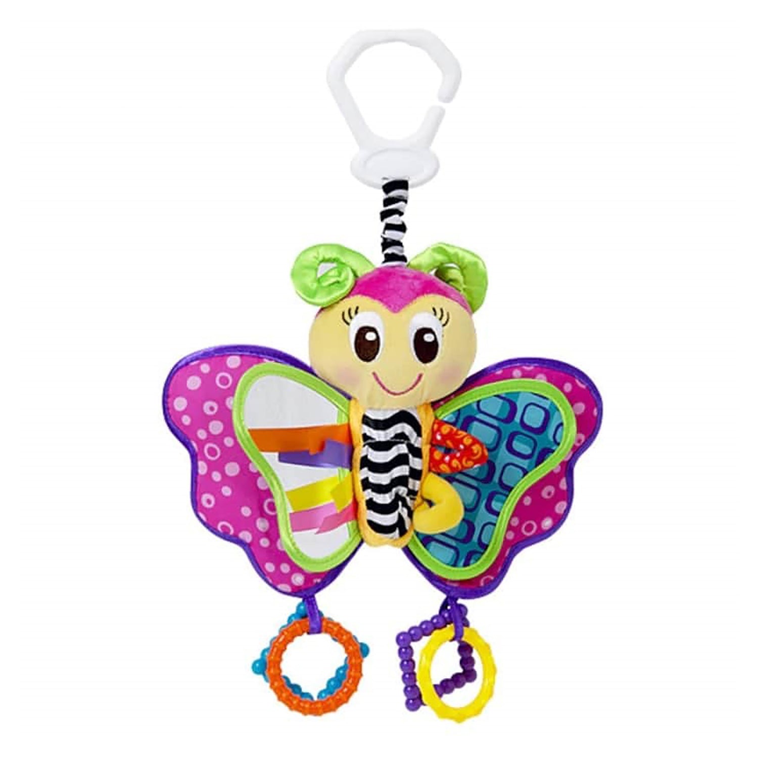 Meet the cute and delightful Blossom Butterfly! With a range of colours and textures for visual and tactile development. Blossom Butterfly has crinkle sounds in the wings, an added mirror feature for fun peek-a-boo play, plastic hanging rings and a whistling sound when butterfly bounces.