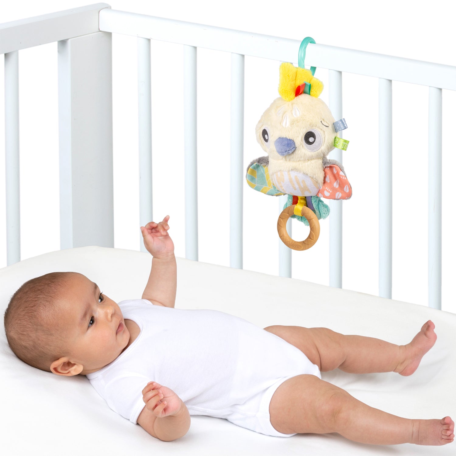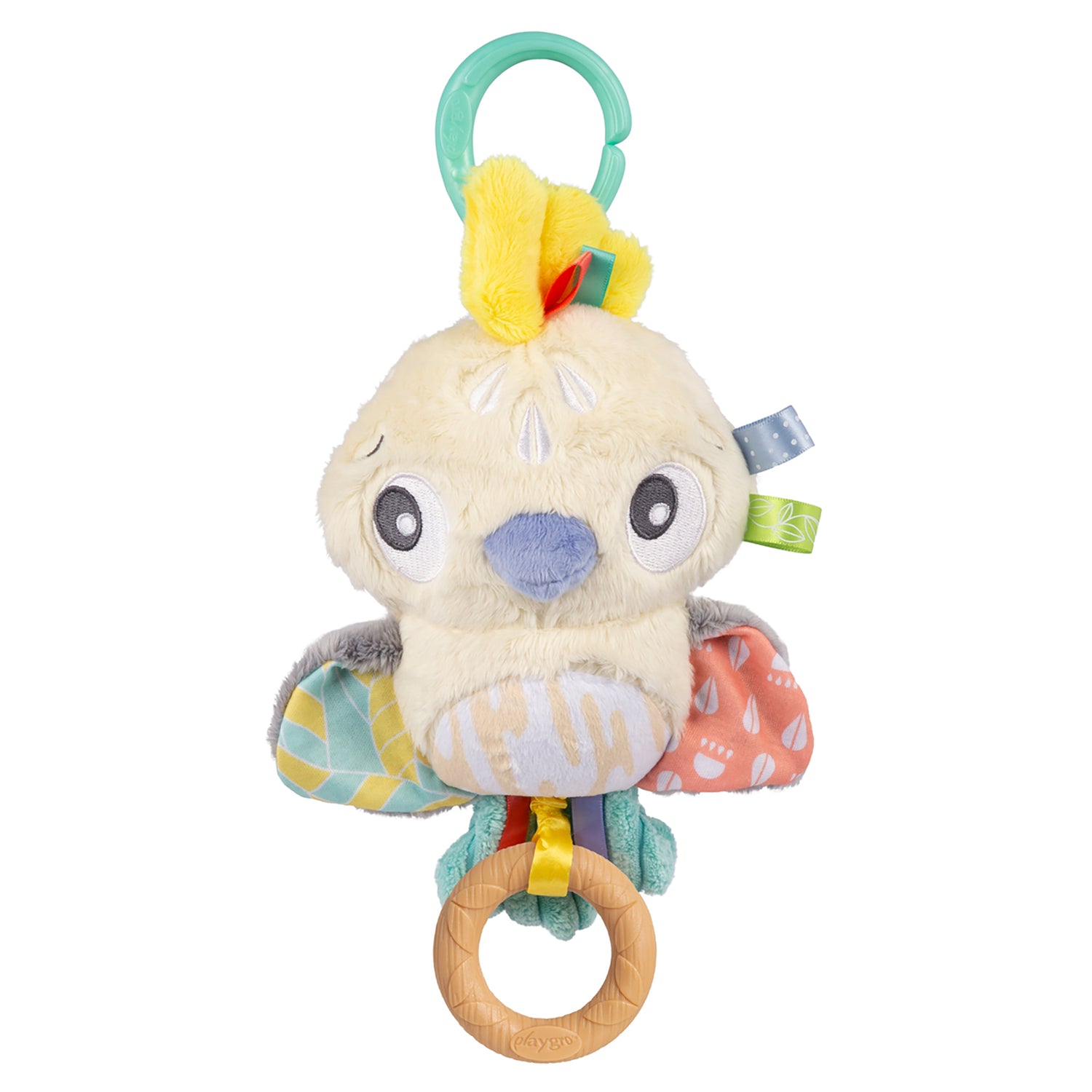 Hello Cocky! This adorable Fauna Friends Pullstring Cockatoo is ready to bring happy tunes, sensory discoveries and a soothing presence to baby. Oh-so soft fabrics and fresh contemporary colours and prints make this an engaging toy for your little one. Cockatoo attaches to baby's stroller, car seat, capsule, cot or play gym with a convenient clip and features tactile ribbons and materials that will encourage baby to reach, touch and grasp. An easy to pull textured teether ring plays comforting musical tunes and provides opportunity for baby to explore with their mouth. A beautiful keepsake, this musical Cockatoo coordinates perfectly with all toys and textiles from our Playgro Home Fauna Friends coordinates range. Easy attach clip for cot, play gym or on the go Pull ring to play happy tunes that engage and comfort baby Ribbon loops and plush materials encourage tactile exploration Textured teether ring provides soothing counterpressure on tender gums Part of a coordinated range featuring soft contemporary colours and patterns inspired by Australian flora and fauna.