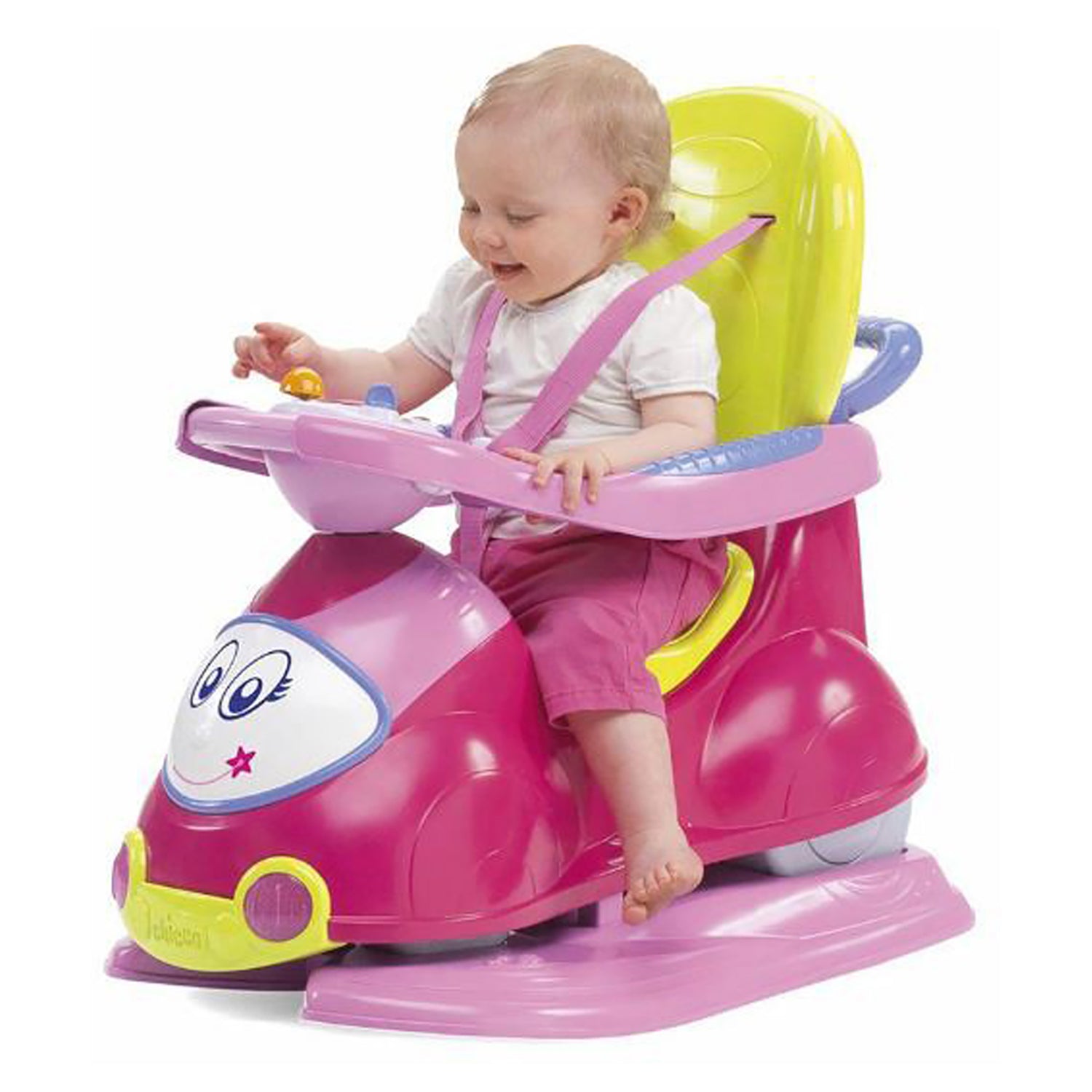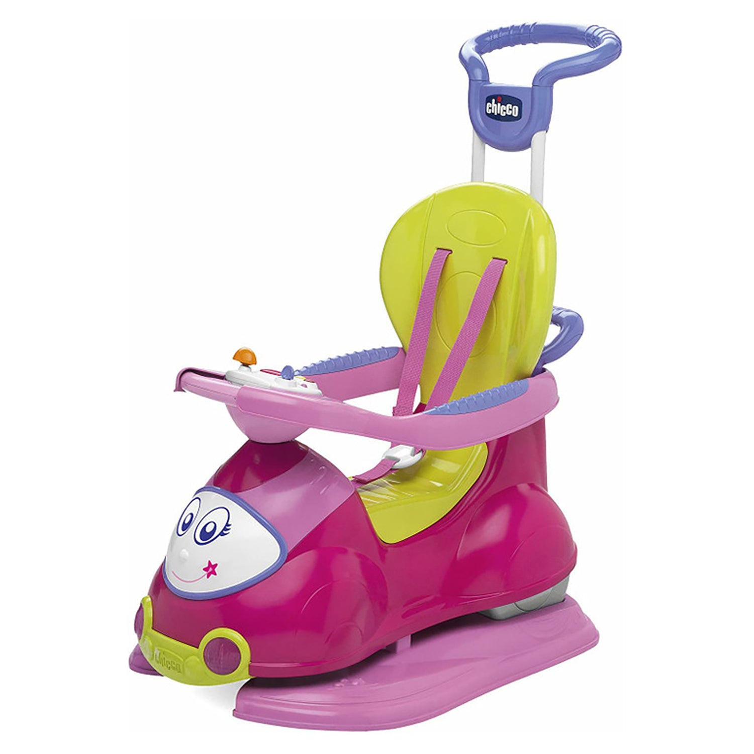 Quattro, the developmental sit'n'ride from Chicco. A sit n' ride car that offers 4 play modes to follow baby's growth: 1. Rocker: suitable for small children, thanks to its stable rocking base,safety bar and harness. 2. Push n' Go: with footrest, safety harness and practical handle for parents to push and steer. 3. Push n' Walk: featuring a handy support for baby's first steps. 4. Sit n' Ride: allows the child to push themselves along freely with their legs. Complete with fun activity center on the steering wheel, usable in all 4 modes and removable to play with anywhere.