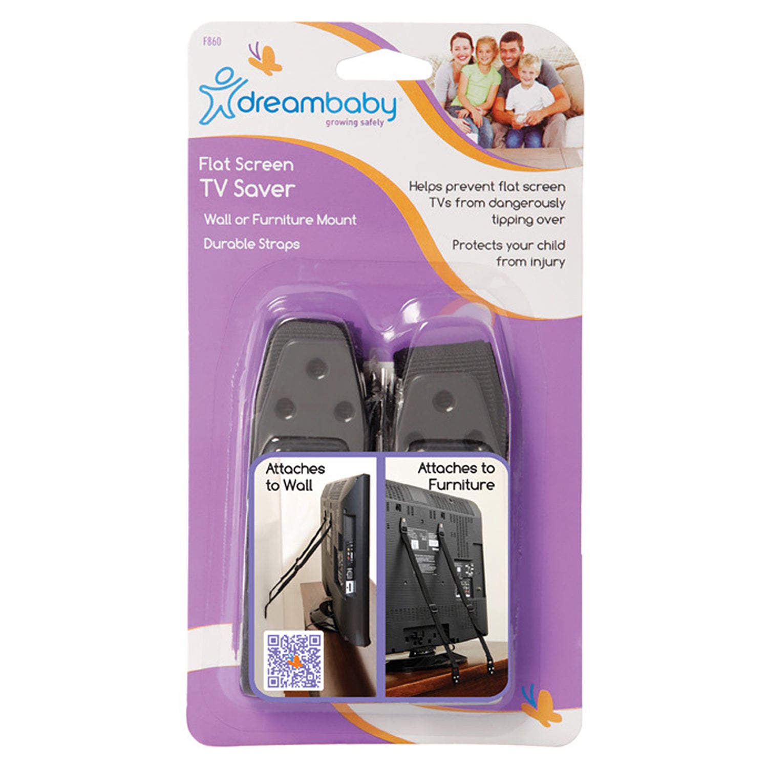 Dreambaby Flat Screen TV Savers prevent potentially serious accidents by anchoring the television to the wall or furniture with adjustable, heavy-duty straps.