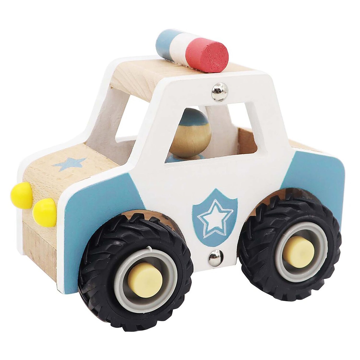 Waa Waa Waa Waa. Watch out, the police car needs to get by and rescue someone stuck in a well! Kids will play for hours with this sturdy wooden police car with rubber wheels to protect surfaces. With a sturdy frame made from natural beech wood and non-toxic paint, this police car will put up with the rough and tumble of play Suitable Age: 18 Months +