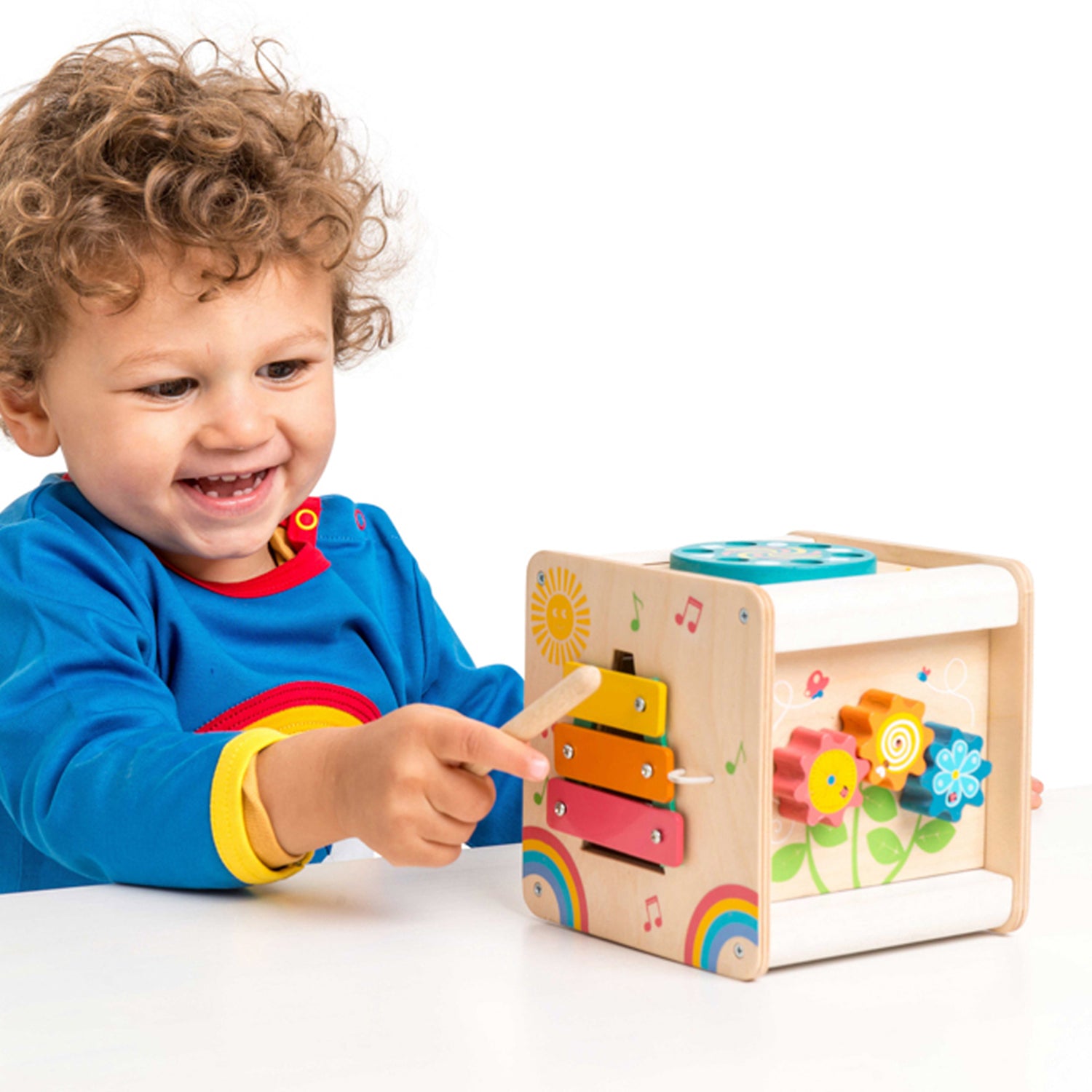 Compact activity cube to entertain toddlers while developing logic and fine motor skills.