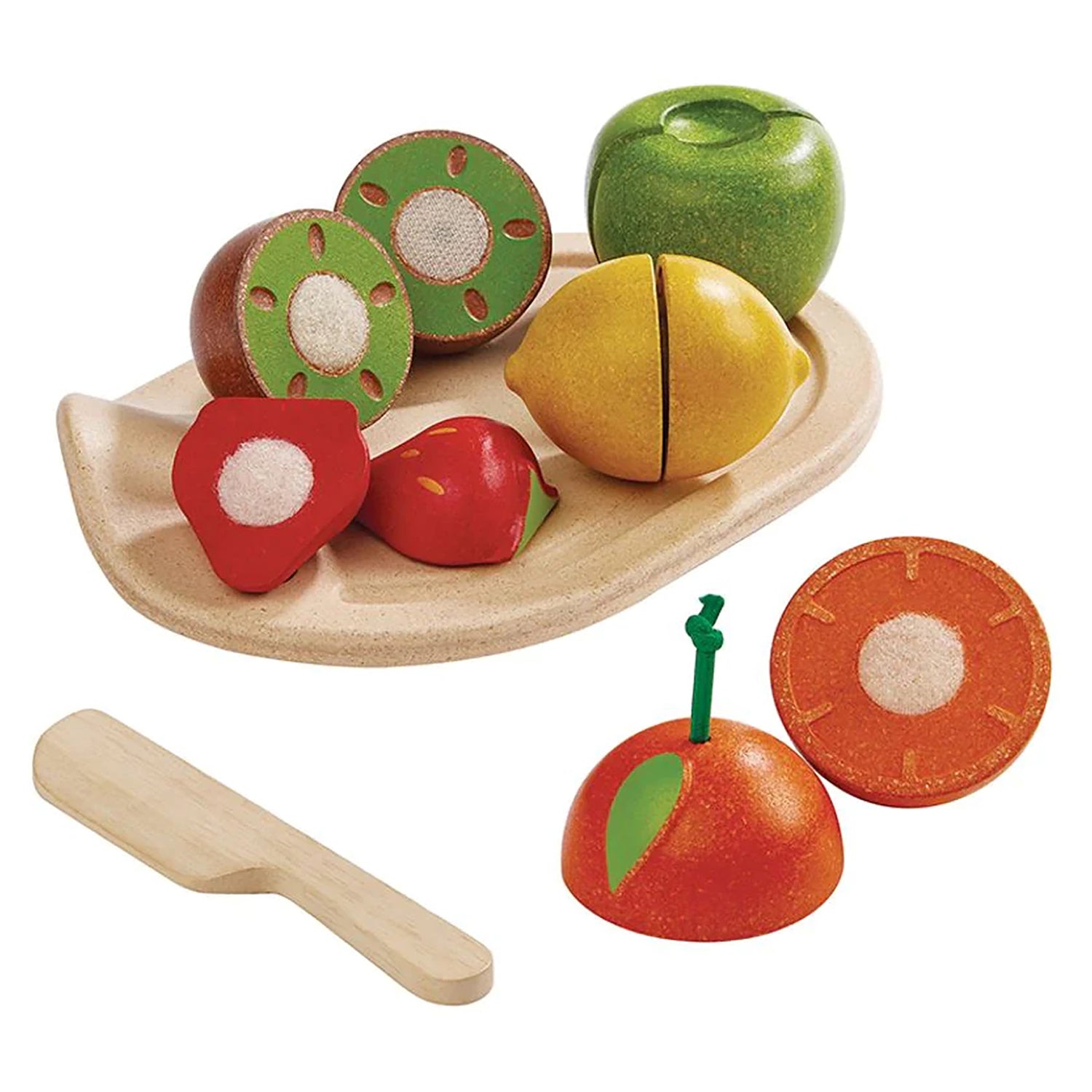 The Assorted Fruit set includes a cutting board, knife, and 5 sliceable fruits: orange, lemon, kiwi, strawberry, and apple. Tactile details offer realistic play.Great for pretend play. Children will be able to prepare and cut fruit just like they see adults doThe fruits are sliceable with hook and hook-and-loop connection systemThe set includes 1 orange, 1 lemon, 1 kiwi, 1 strawberry, 1 apple, 1 knife, and a cutting boardSustainably made in Thailand using chemical-free rubberwood, formaldehyde-free glue, organic pigments, and water-based dyes.