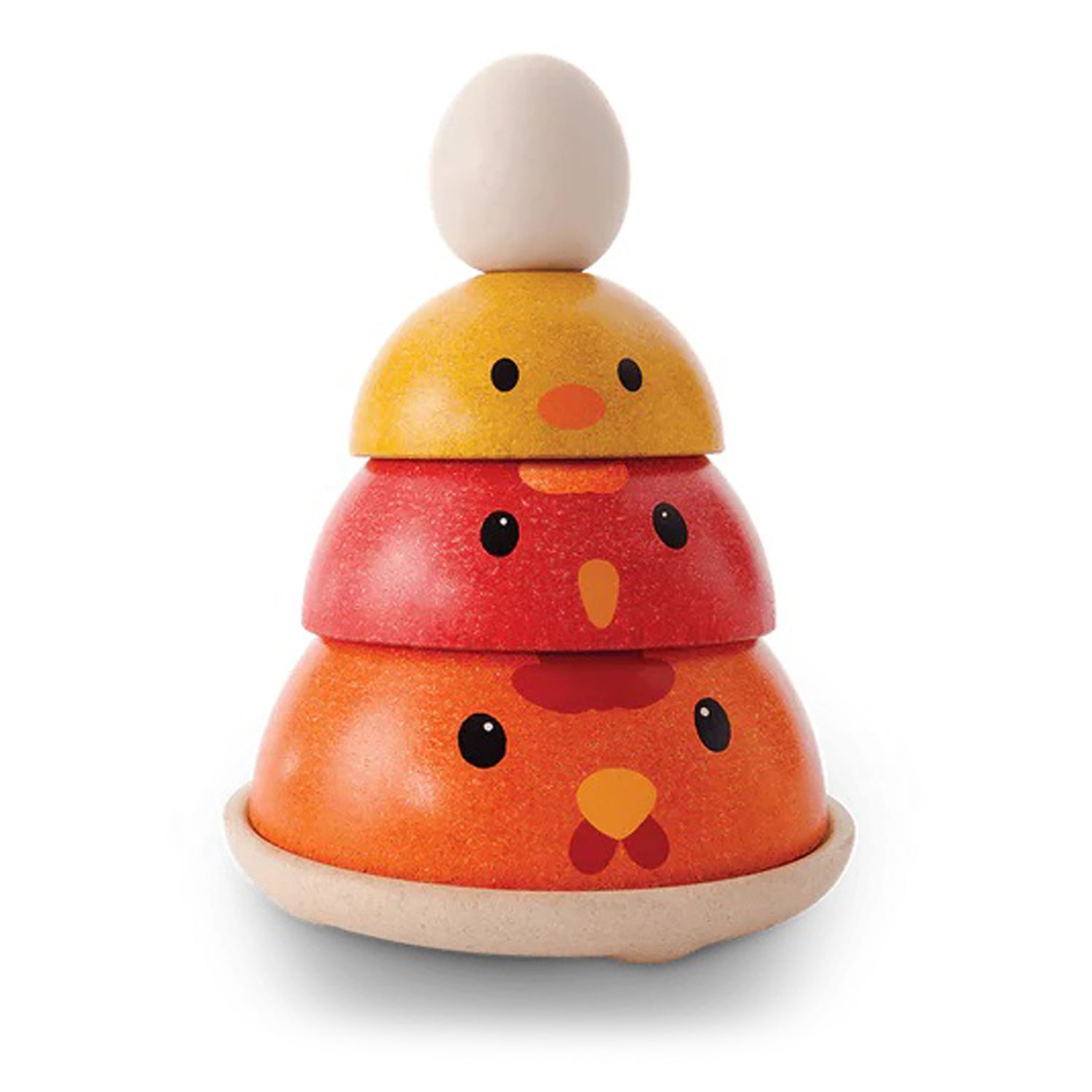 This basic nesting toy comes with a chicken theme. It consists of 4 pieces and a circle base. Children can learn about the sequencing, and life cycle of a chicken and play in various styles.Includes:4 pieces for stacking and a nesting baseStrengthen fine motor skills, develop logical thinking and problem-solving, and practice size/shape orderingTime yourself as you stack the chicken for an added challenge!Sustainably made in Thailand using chemical-free rubberwood, formaldehyde-free glue, organic pigments, and water-based dyes.