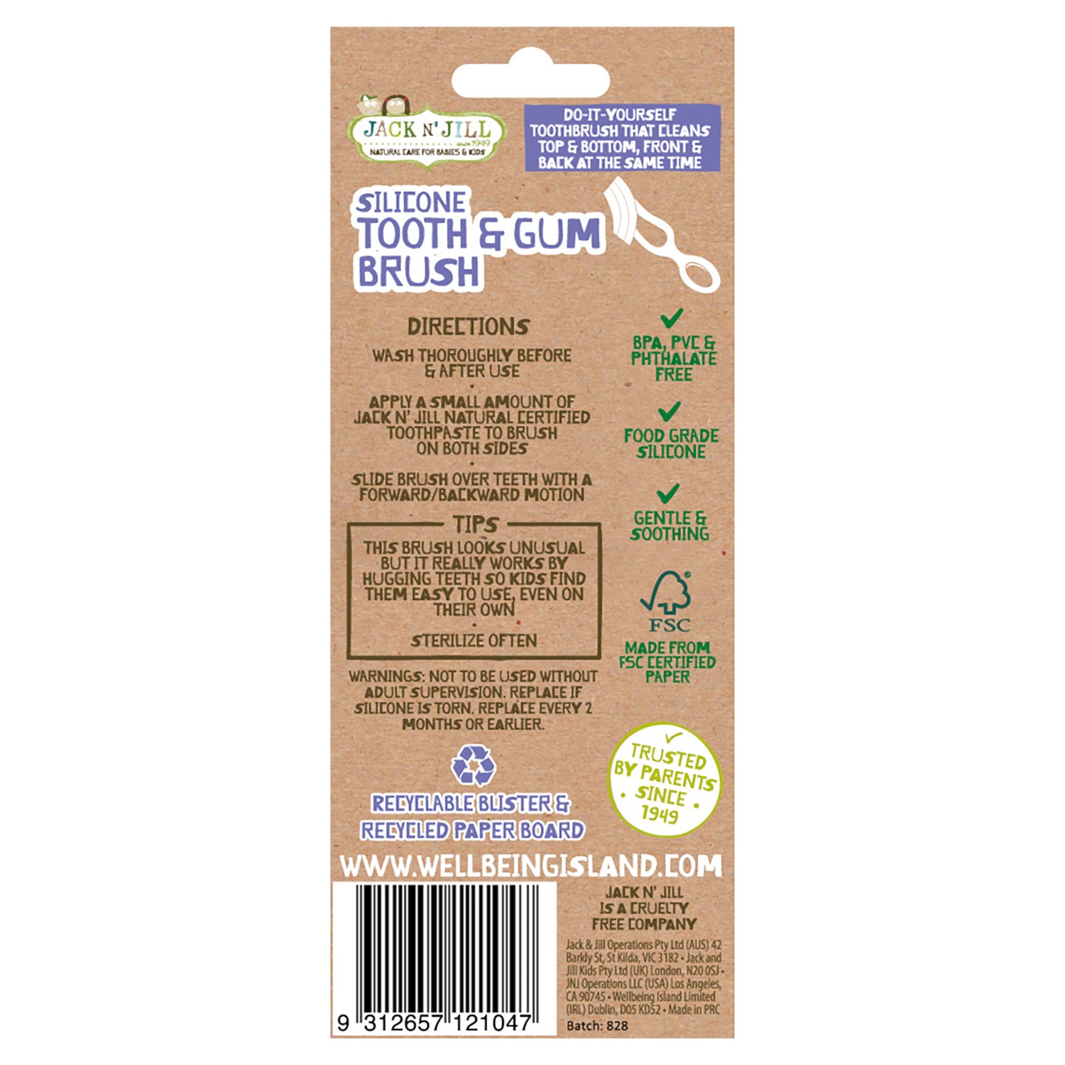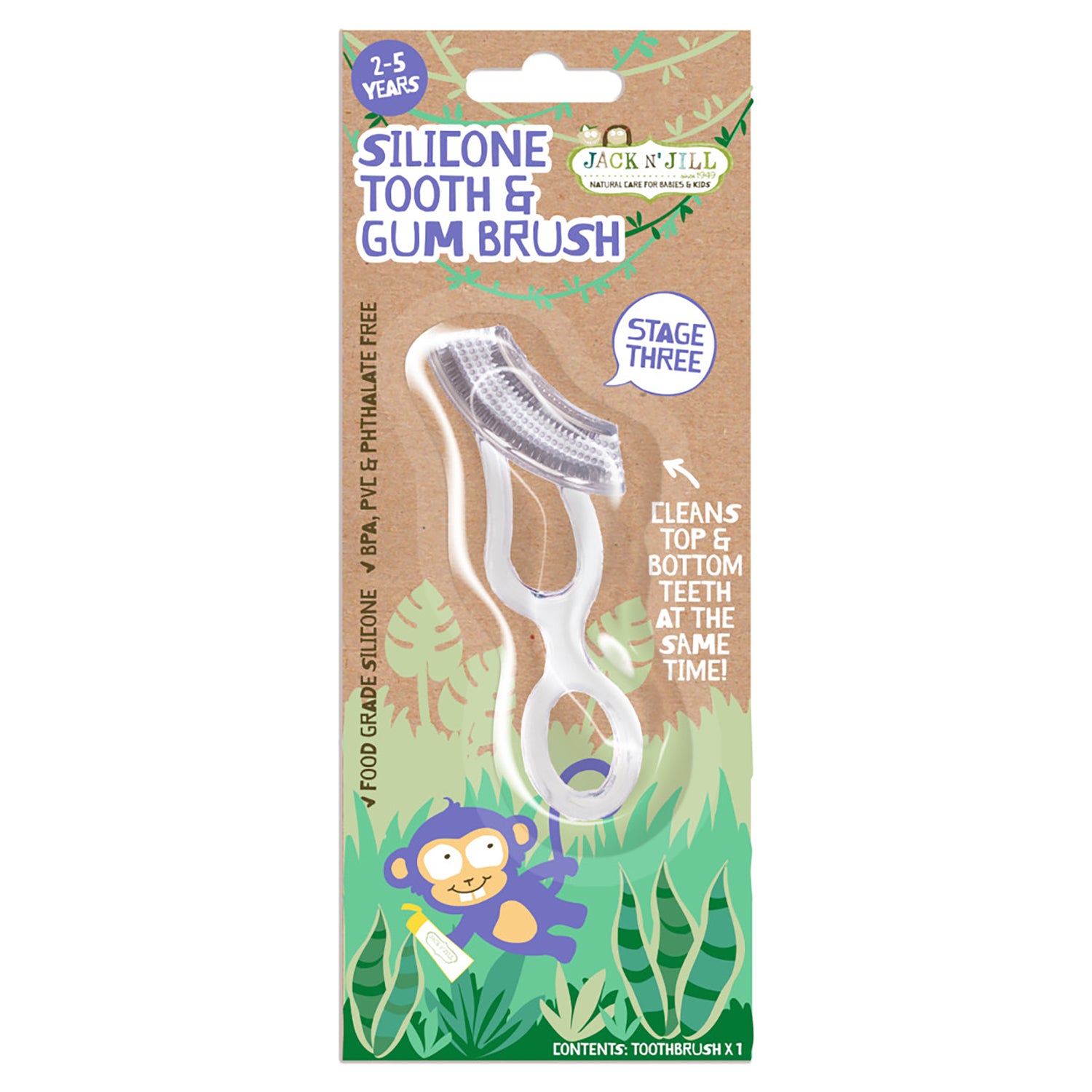 Jack N' Jill Kids Silicone Tooth & Gum Brush - Stage 3. This unconventional looking toothbrush may be a little hard to appreciate at first. Hand it to a 2-3 year old and watch them magically and intuitively brush their teeth almost immediately. Made from 100% medical/food grade silicone.