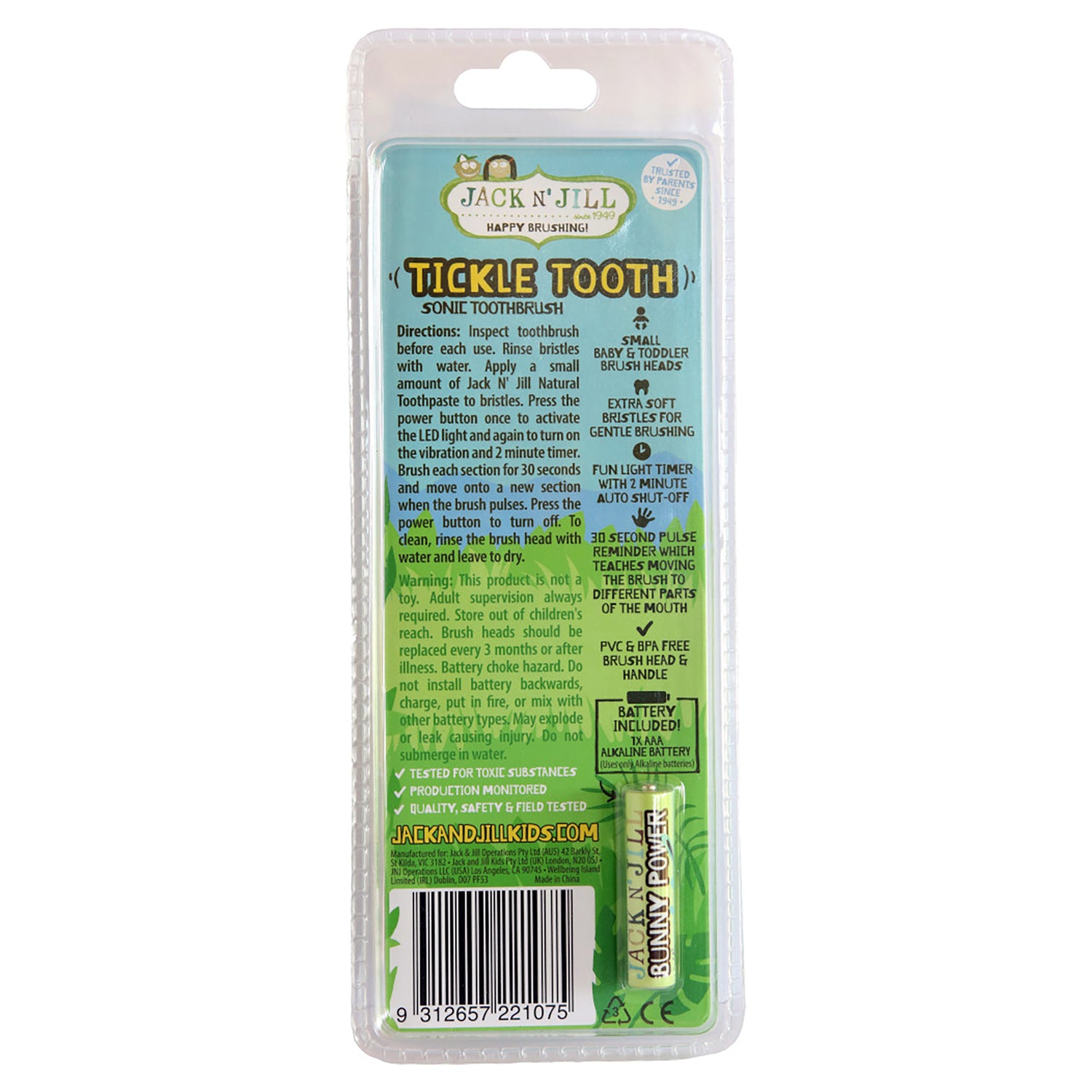 Jack N' Jill Kids Sonic Toothbrush with LED Light makes brushing fun with our unique LED light up brush head to assist with inspection of tiny teeth. The Sonic technology includes 30 second pulse reminder which teaches moving the brush to different parts of the mouth. PVC & BPA free brush head and handle.
