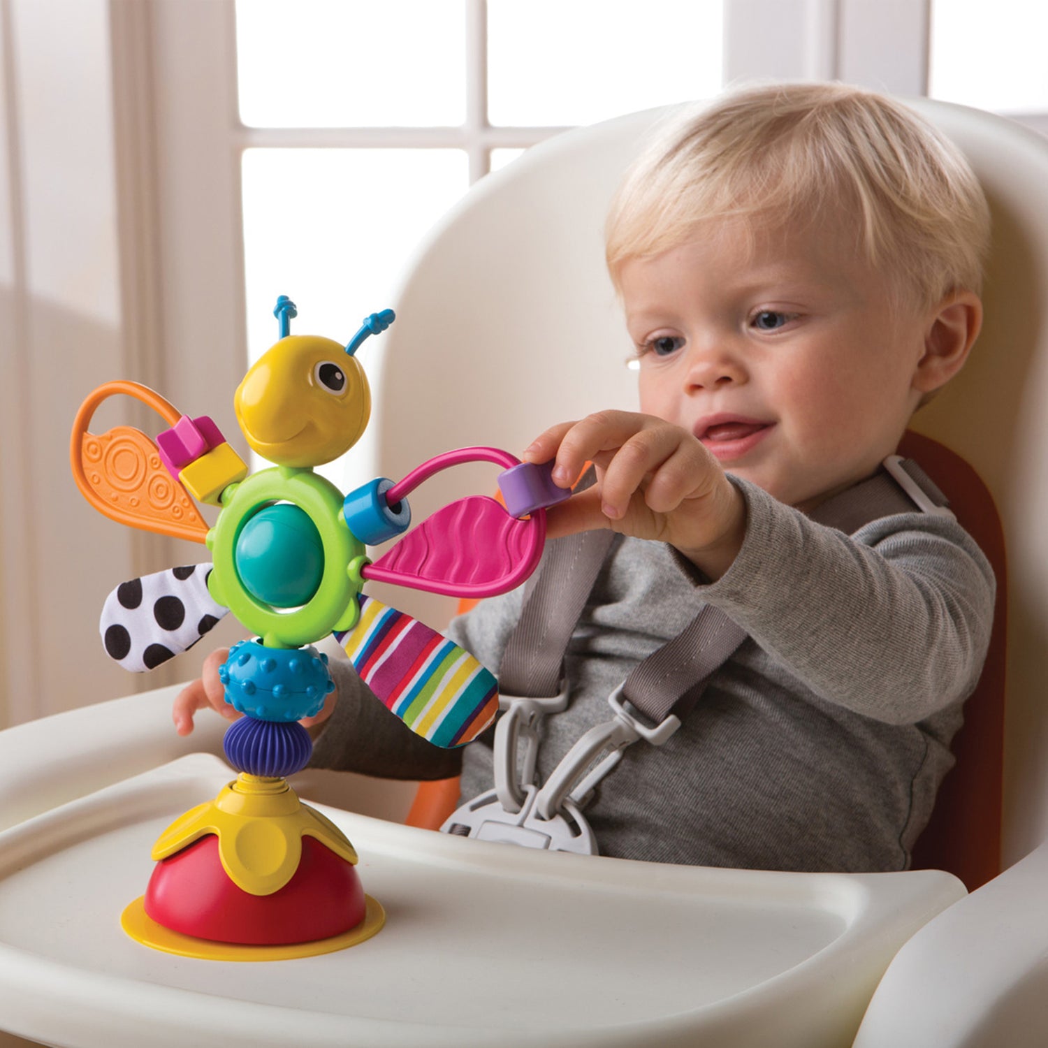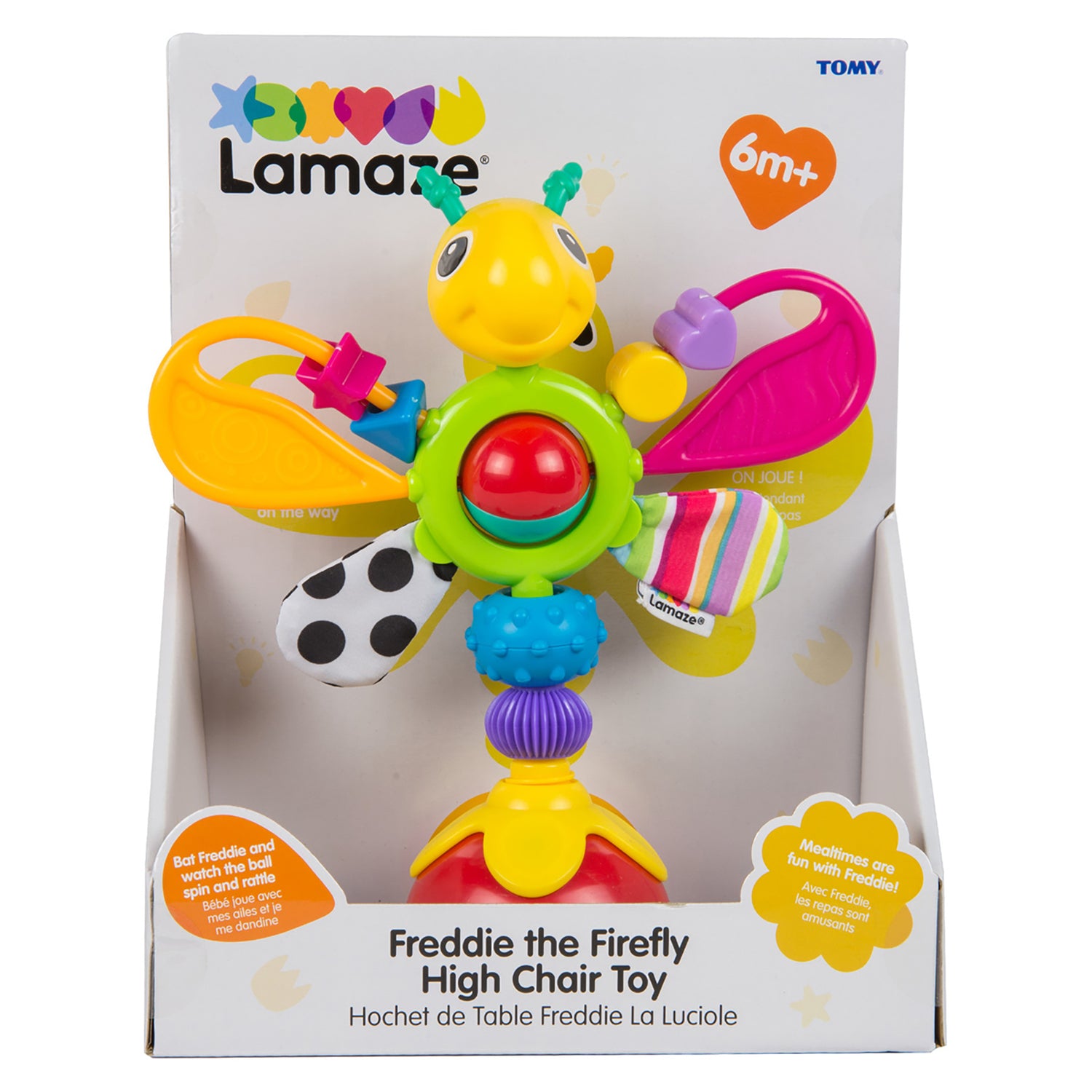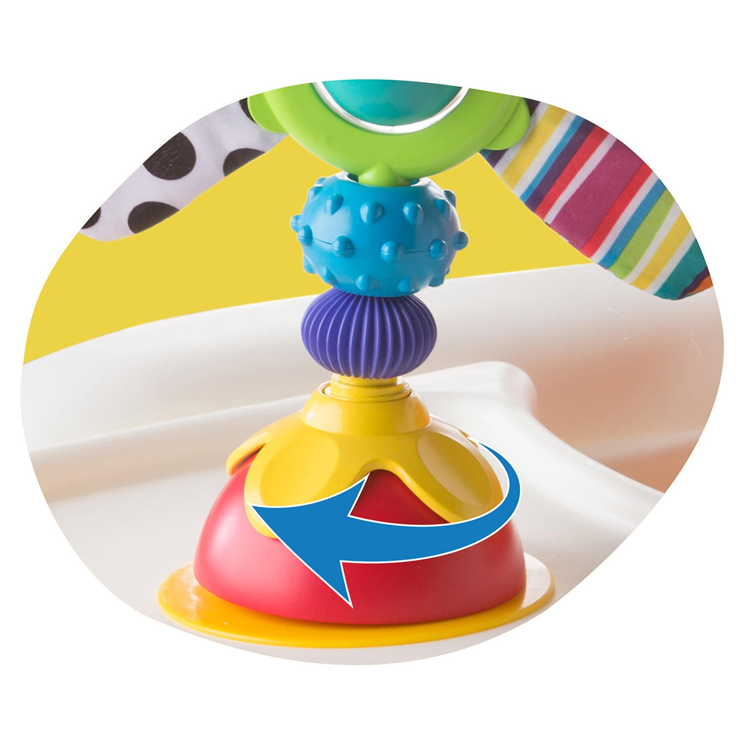 Freddie helps to pass the time and makes sure your little one looks forward to every meal time. A suction cup attaches Freddie to table tops or high chairs, keeping him firmly in place. Each colourful segment spins around a flexible, bendy stem. Your baby will be entertained by Freddie's spinning ball, knobbly rings, crinkle wings, and chunky beads which slide around colourful teething wings.