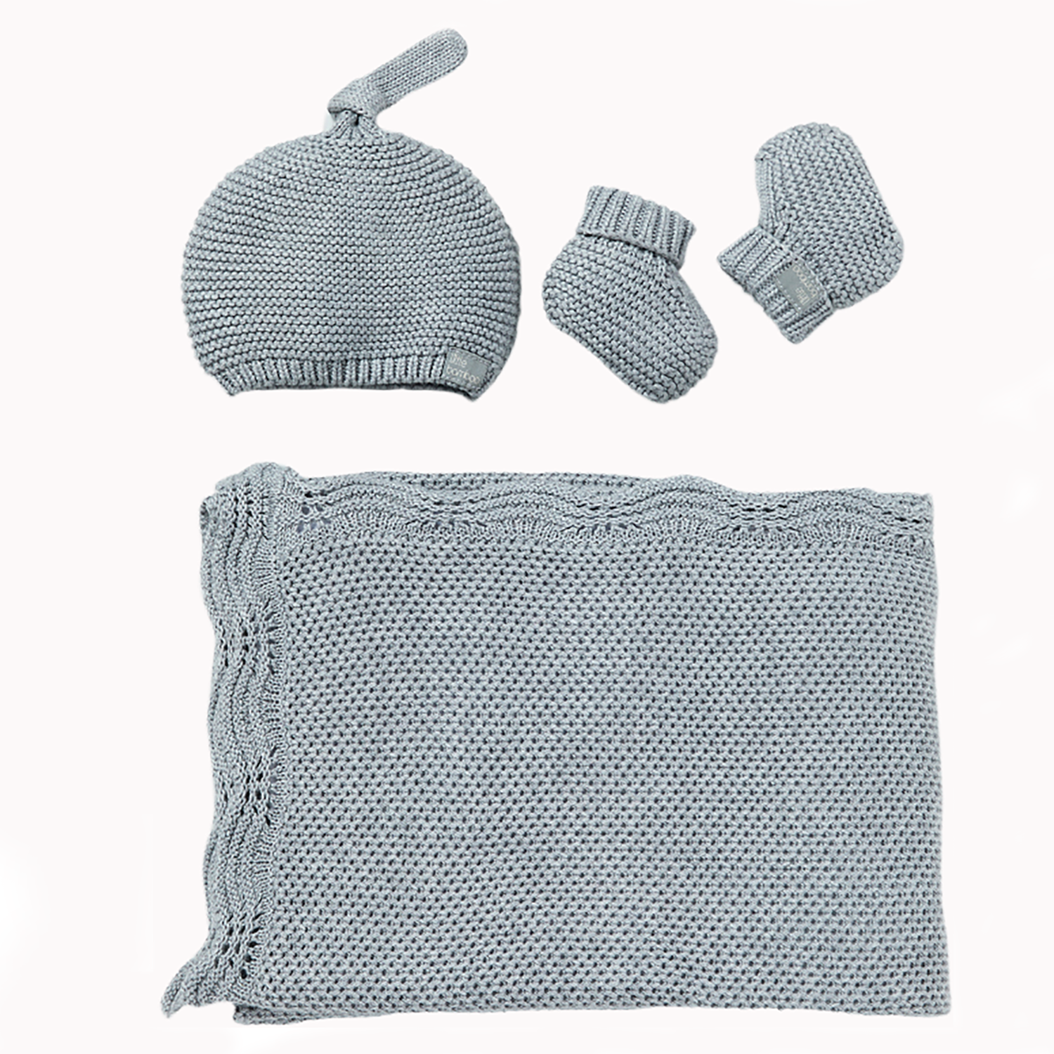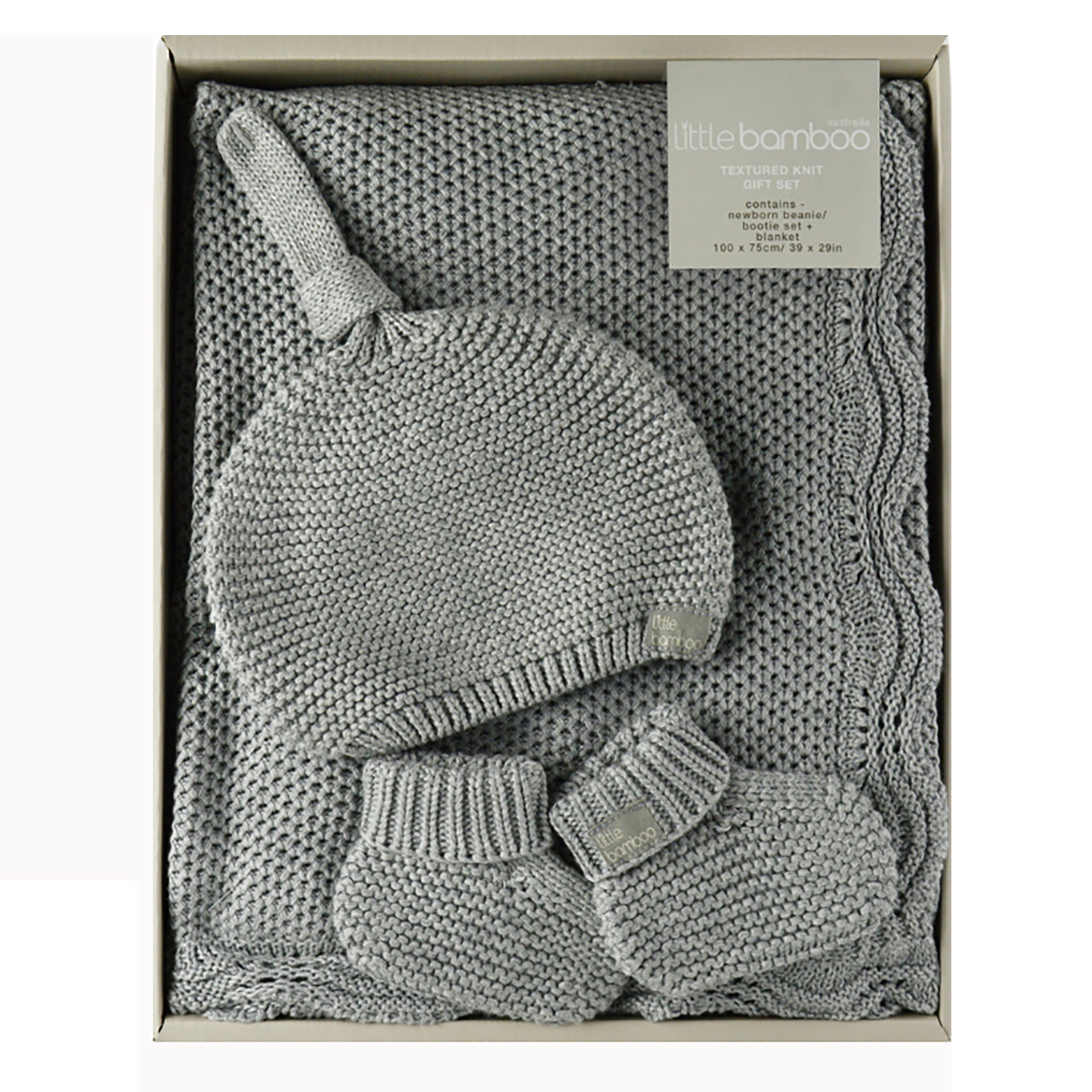 Bamboo textured knit gift set - Marle Grey is a modern and sophisticated newborn gift set that will surround your baby with softness. The premium blend of viscose from bamboo for softness and cotton for durability gives this blanket a luxurious texture and drape. With added beanie and booties to keep baby warm when out and about.