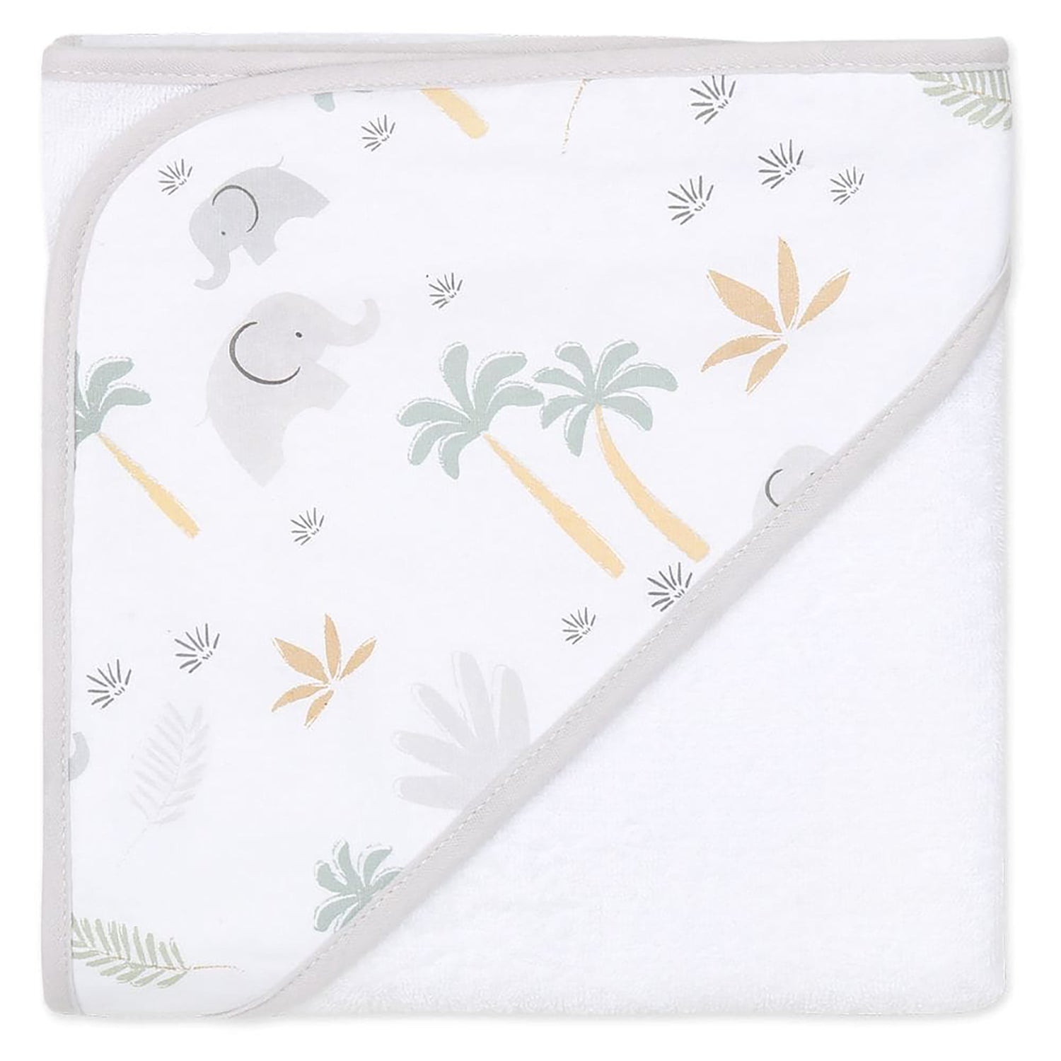 Wrap up your little one in this Grey Elephant Print Hooded Towel by Little Haven. The cotton terry is touchable soft against baby's delicate skin. The white fabric is trimmed with a band of grey that lines the hood as well. Bands of elephants with upturned trunks march across the print on the hood. Hooded towel wraps closed across the chest.