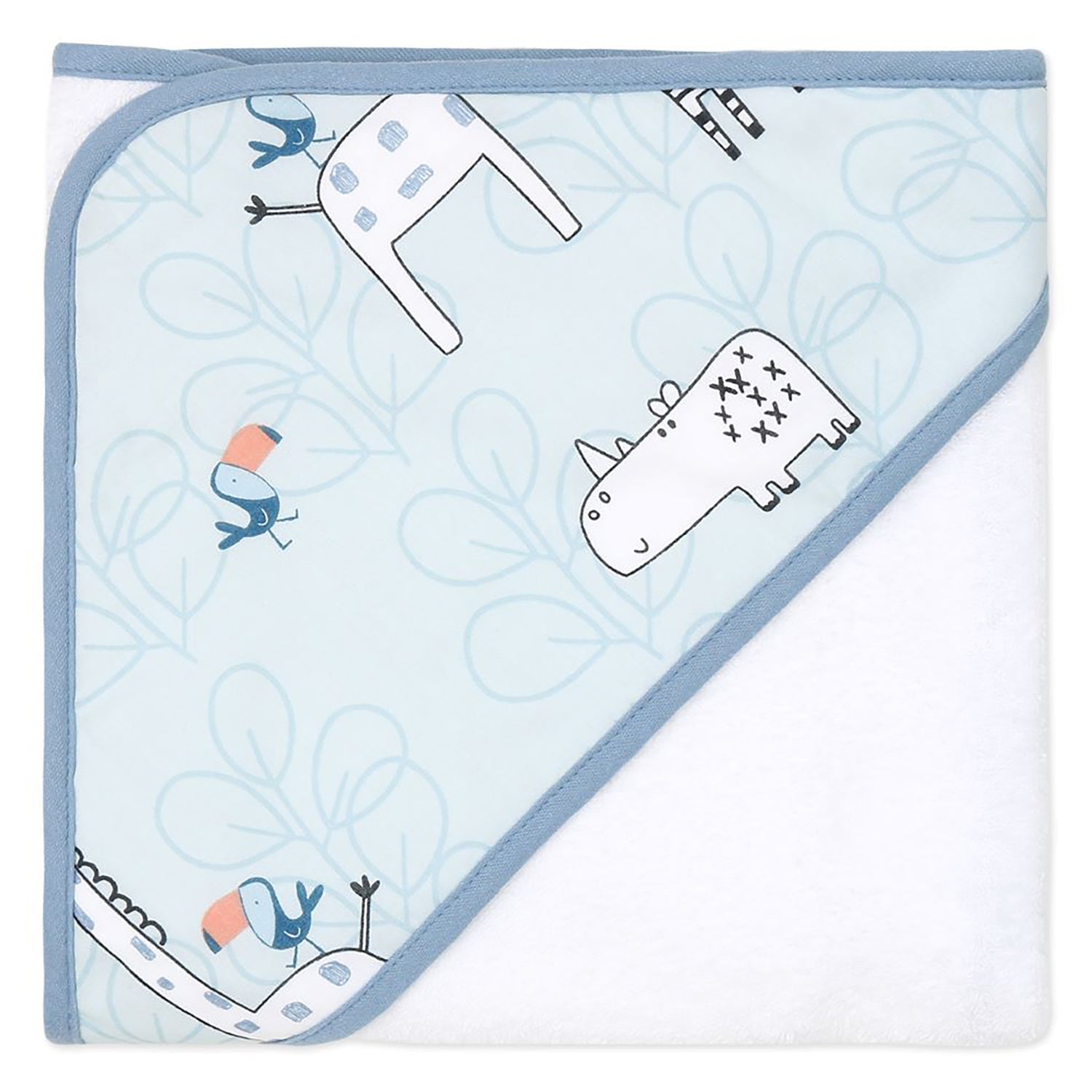 Take a few friends for a dip in the watering hole with the Little Haven Soft Safari Printed Hooded Towel. The soft cotton terry is touchable soft against baby's delicate skin. The white fabric is trimmed with a band of blue that lines the printed hood as well. A print of safari animals decorate the towel hood in shades of blue and black. Tuck baby under the hood to keep warm or for playful after-bath pictures. Envelope style hooded towel wraps closed across the chest. A great new baby gift for a friend or yourself!