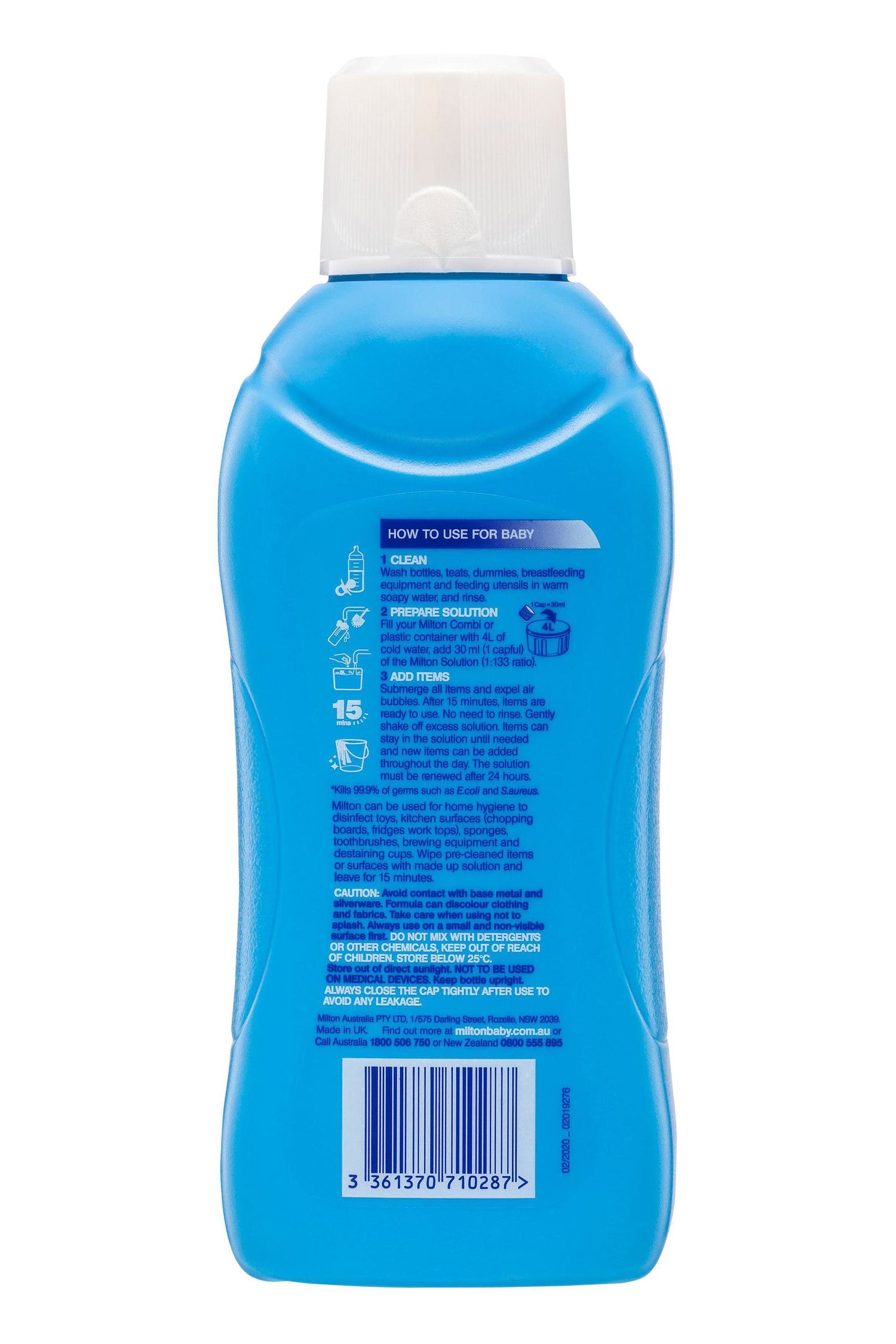 Milton Solution kills 99.9% of germs and sterilises in just 15 minutes. No rinsing required. Solution lasts for 24 hours. Milton fluid is composed of 99% water and naturally occurring materials which when diluted at 1 in 33, matches exactly with body tissues and fluids. The product is safe and effective at protecting the body.Note: do not mix with other detergents or chemicals. Keep out of reach of children.