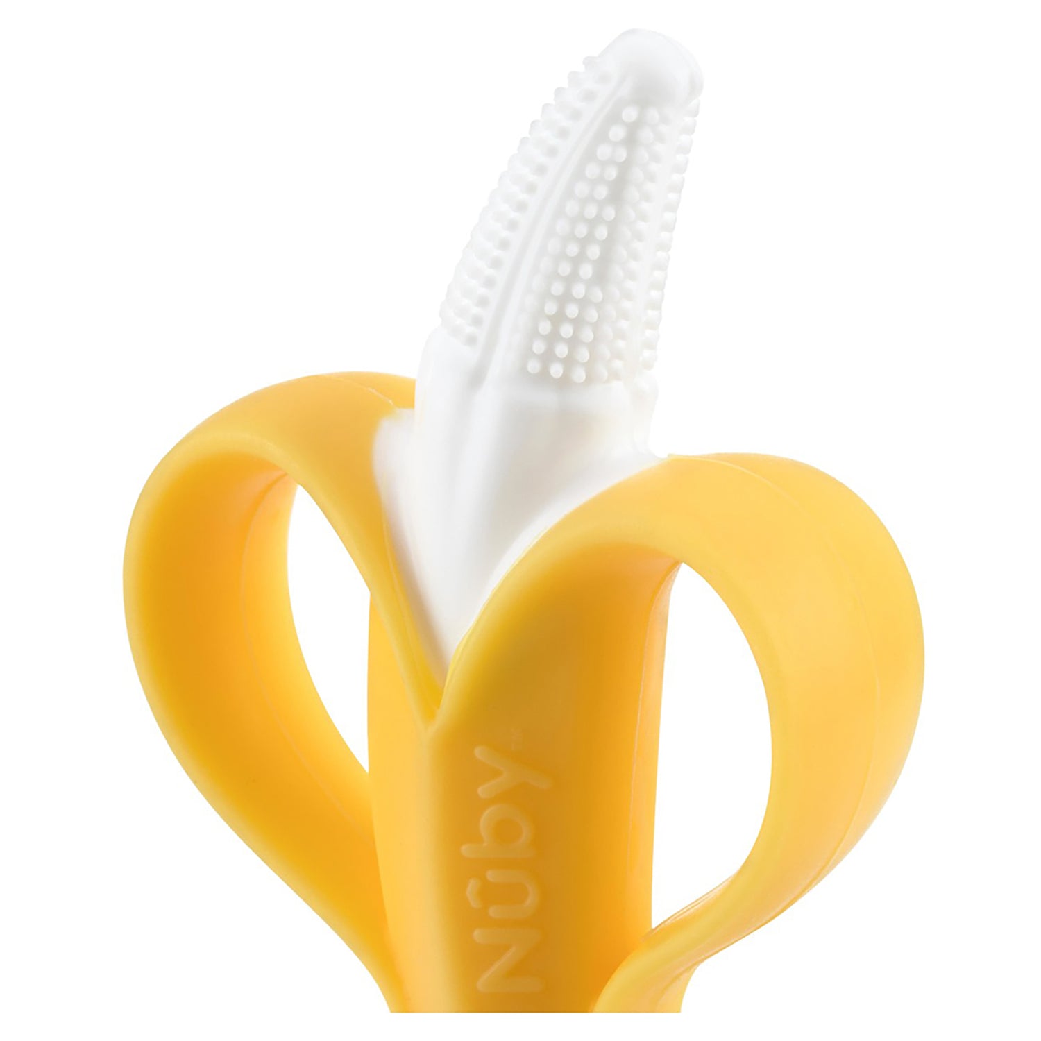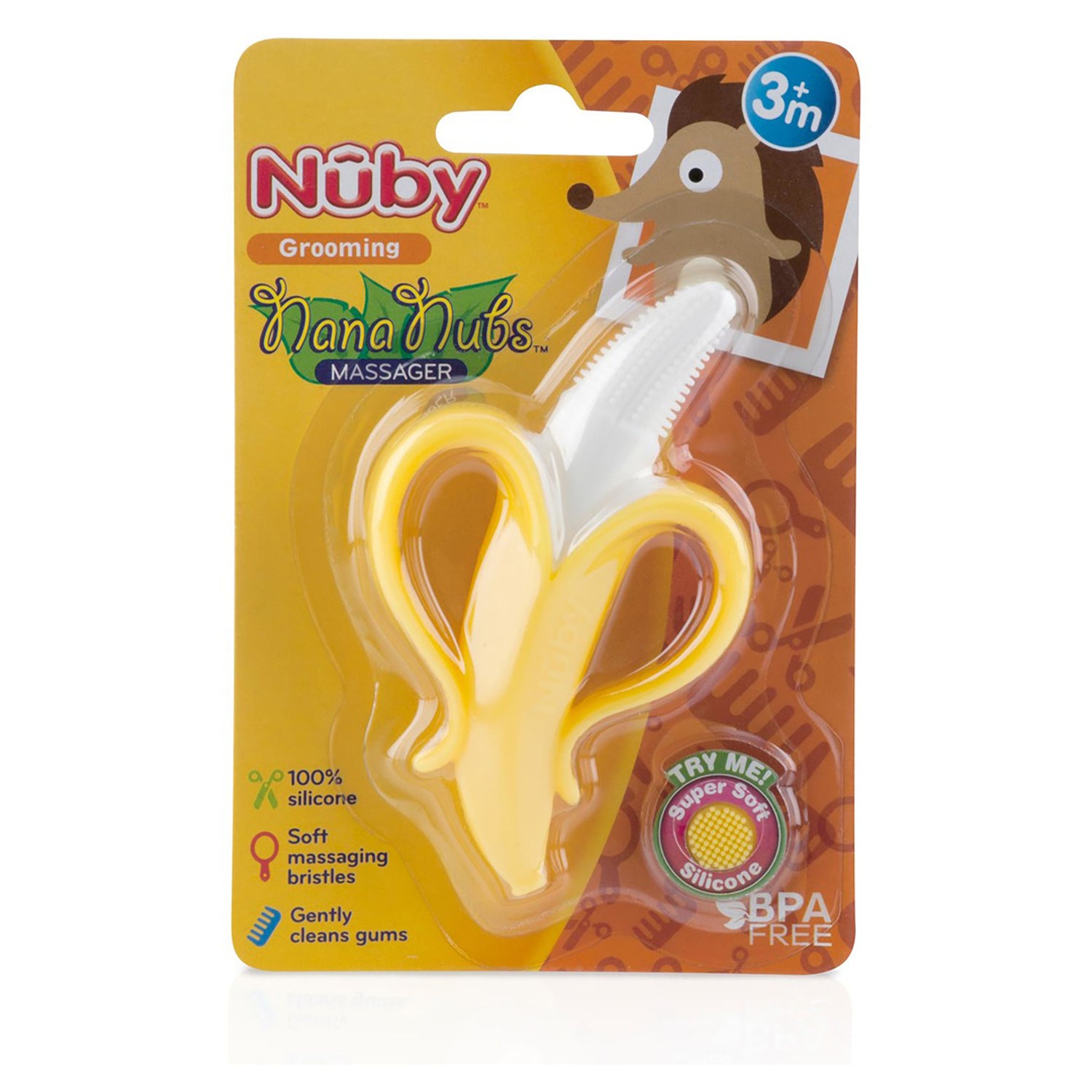 The new NanaNubs Banana Massaging Toothbrush from Nuby is specially designed to instill positive and important dental hygiene for your baby from the beginning. Nuby's NanaNubs Banana Massaging Toothbrush is made of extra soft silicone with your baby's comfort in mind. Massaging bristles clean and soothe new teeth and tender gums.