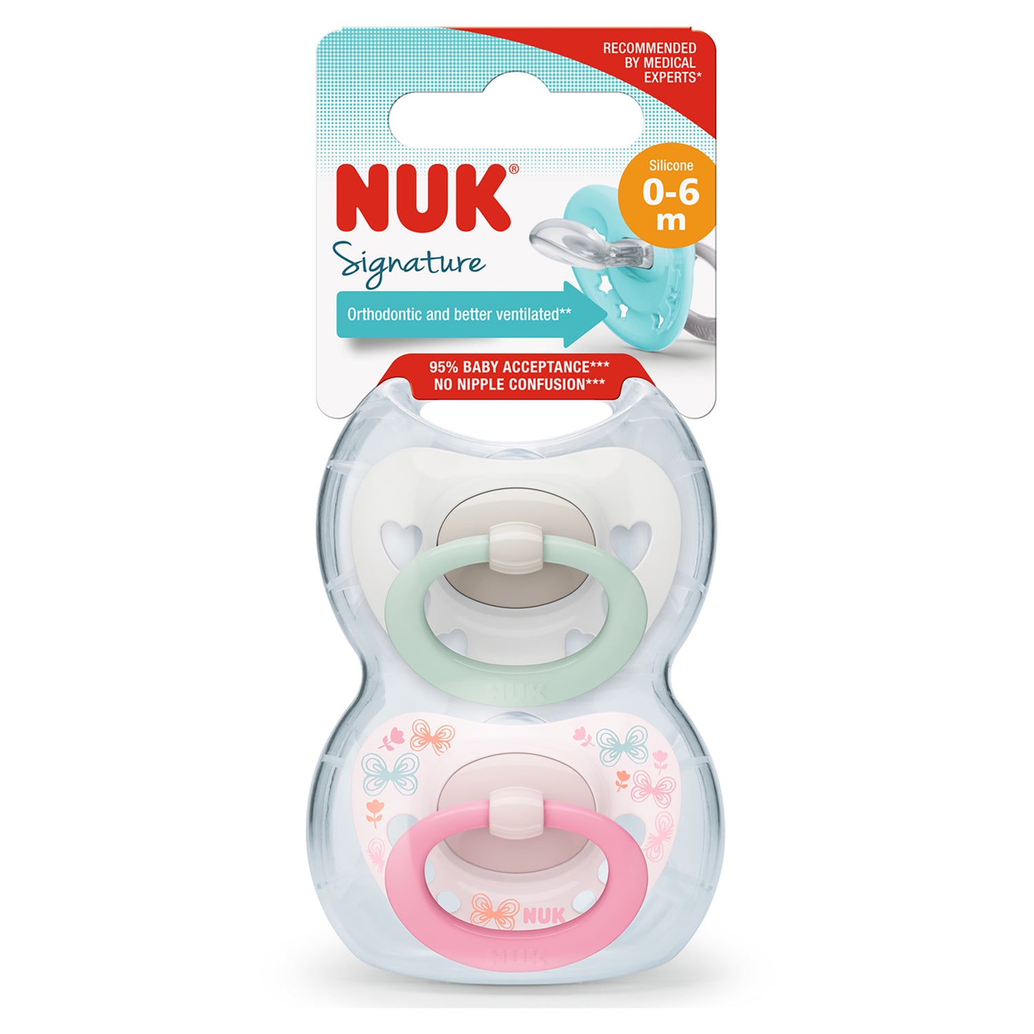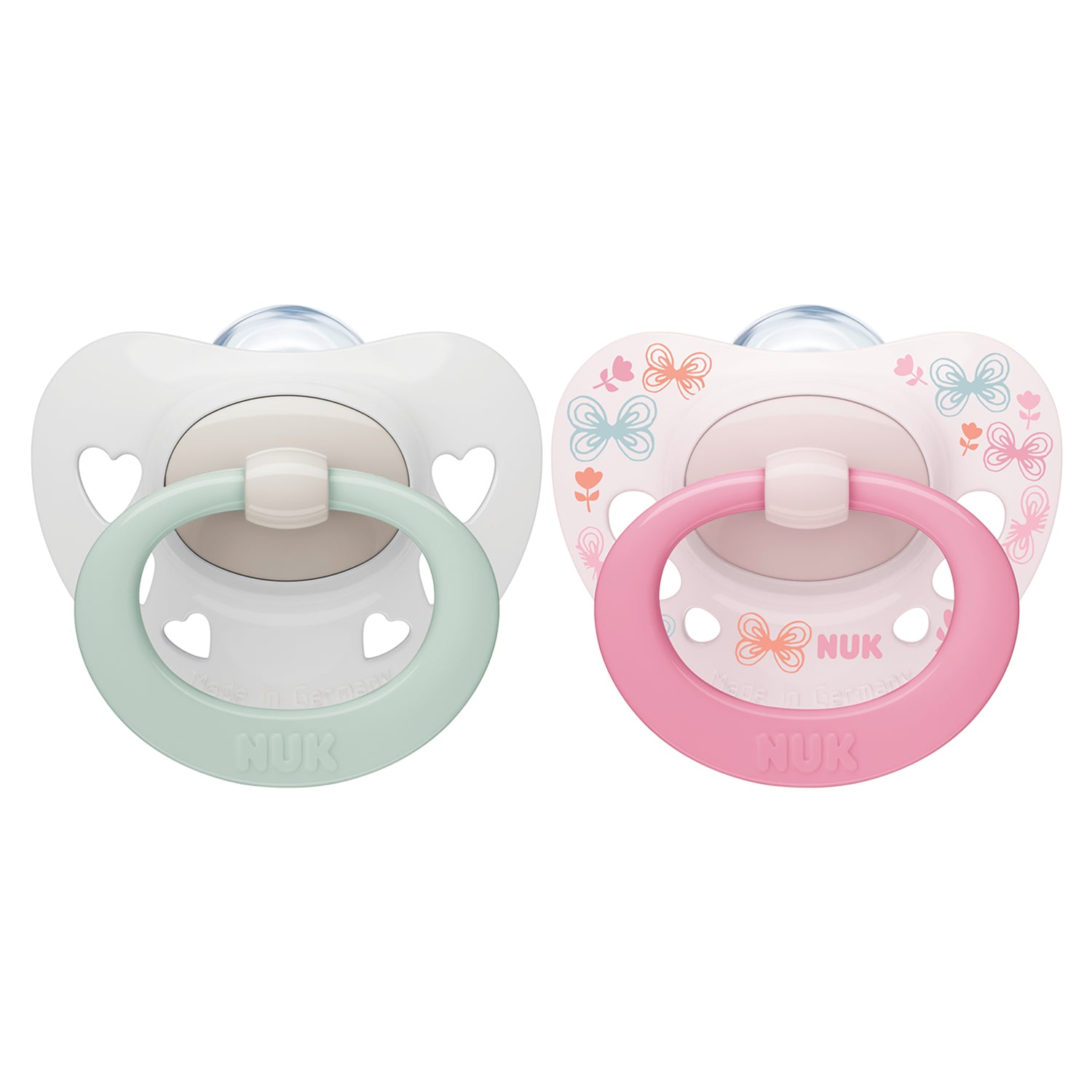 The orthodontic NUK Shape is modelled on a mothers nipple as she breastfeeds and is 95%* accepted by babies Thinner and narrower teat neck reduces pressure on jaws and teeth Flat baglet and smooth underside; pleasant feeling in mouth; plenty room for natural sucking movements Practical soother box cleans soothers on the go - just add water and microwave for 4 minutes Age 0-6 months, BPA-free, 2 per pack